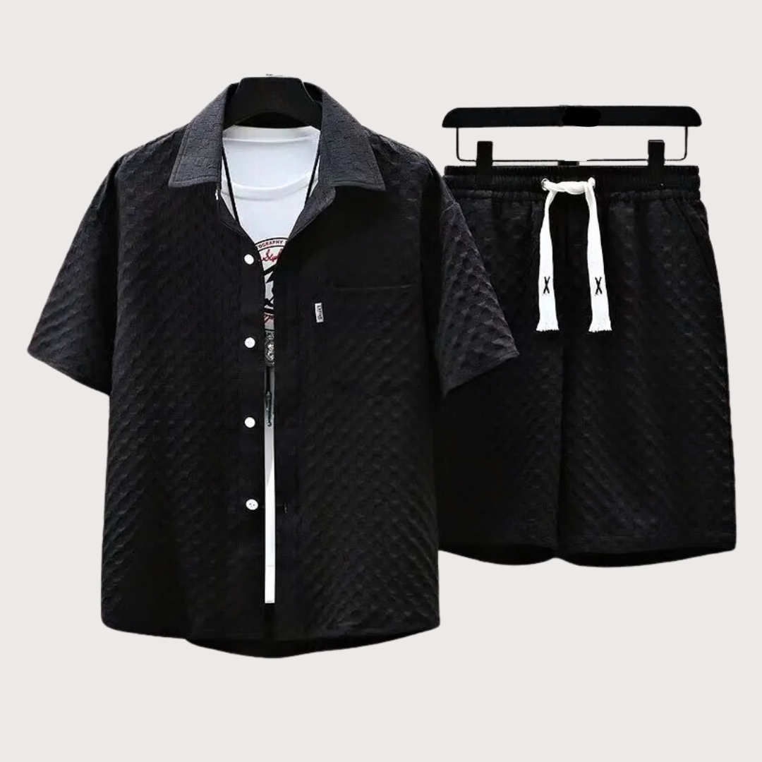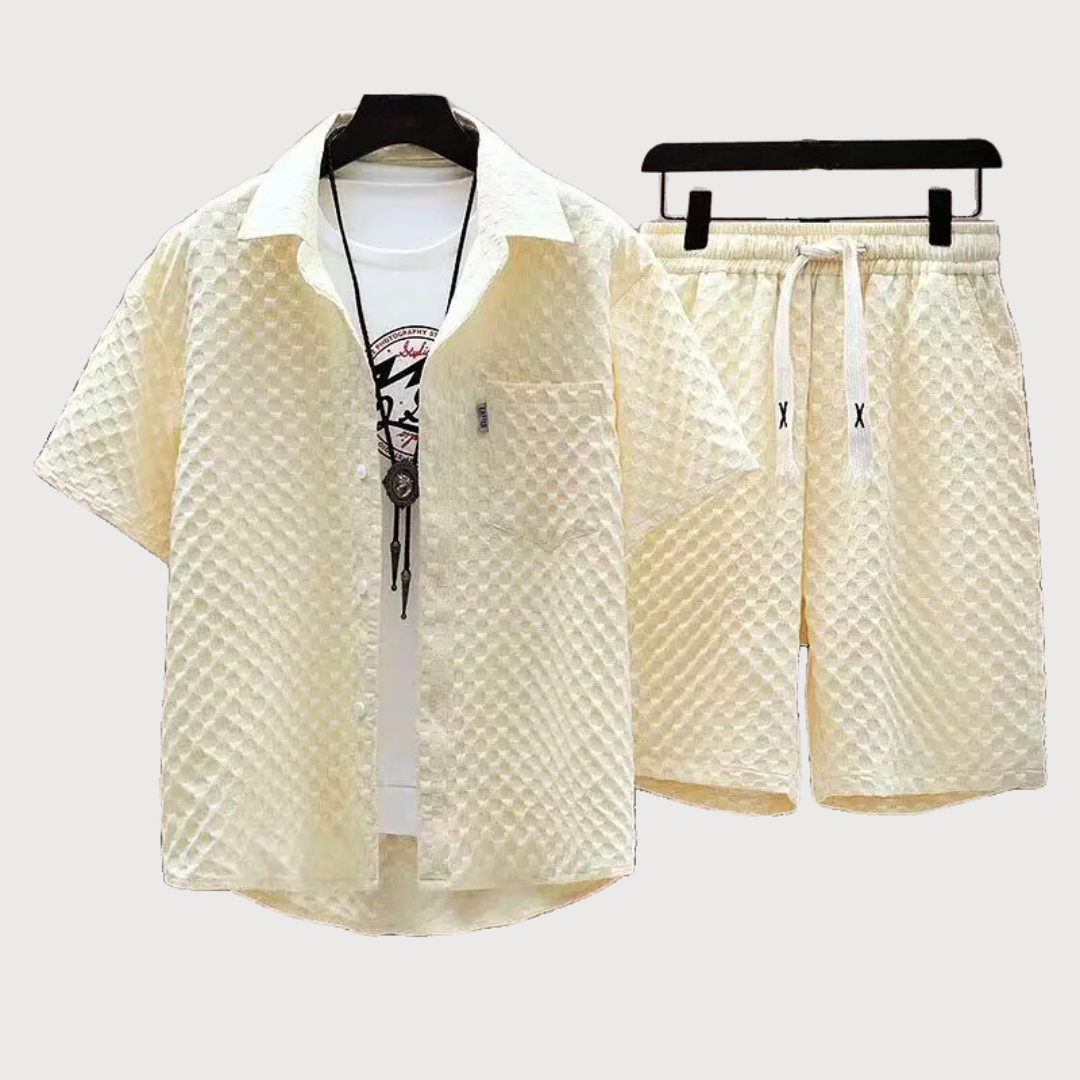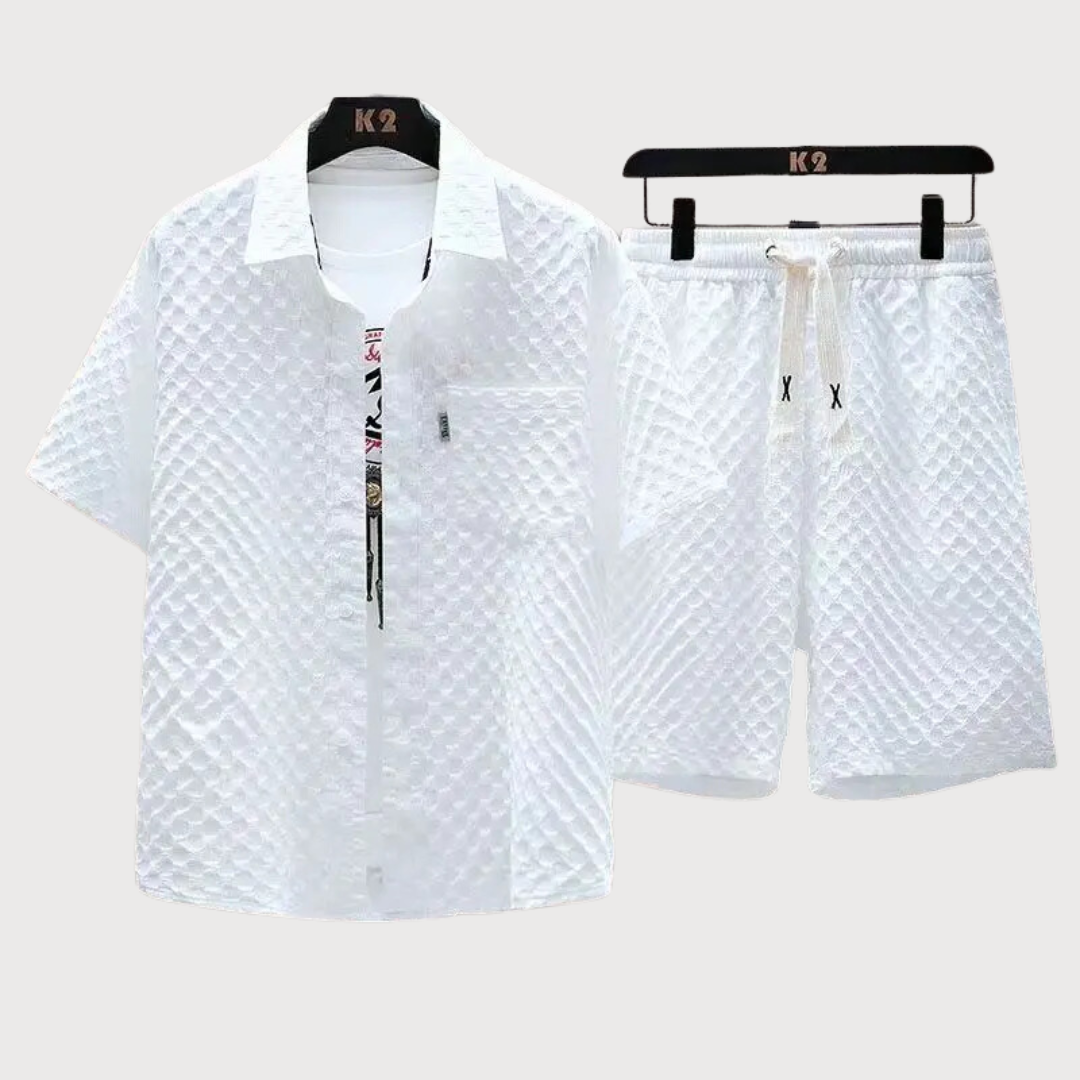 This breezy, subtly textured two-piece morphs from beachside chill to rooftop chic with a drawstring short and adaptable button-up, all in a crisp color palette for effortless summer style that lasts.