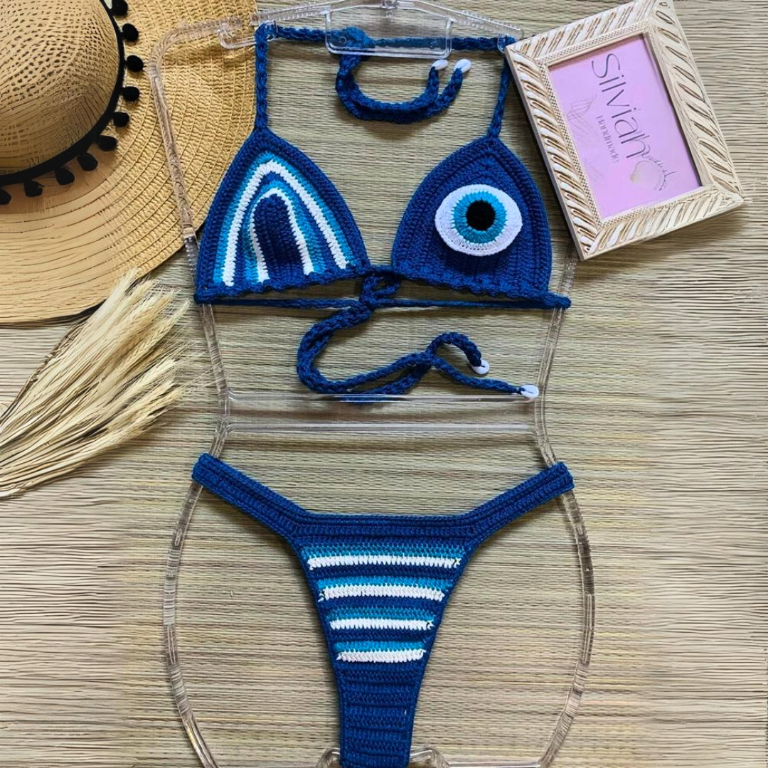 The vibrant shades of blue evoke the tranquil waters of the Nazar Crochet Bikini Set, while the soft, stretchy yarn ensures a comfortable and flattering fit. Make a splash wherever you go with this eye-catching, bohemian-inspired swimsuit that's as unique as you are.