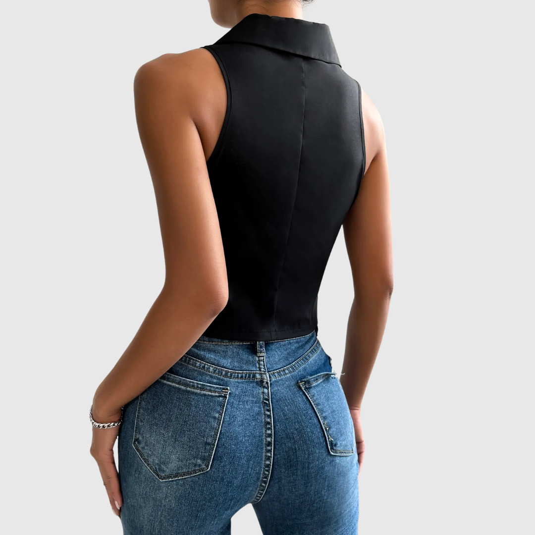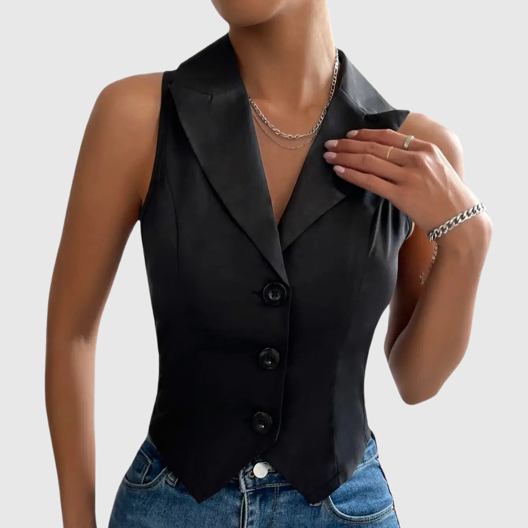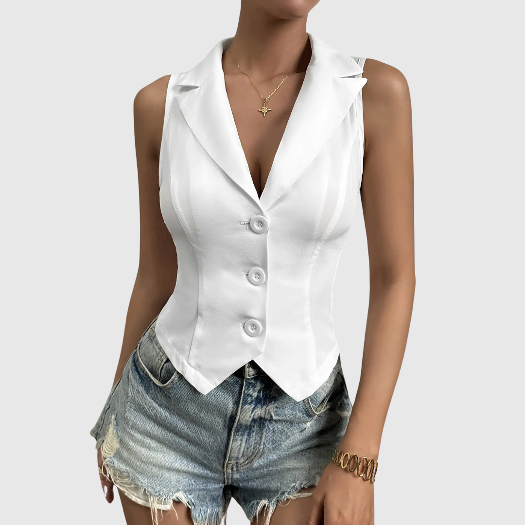 The plunging neckline hints at a daring spirit, while the sharp, notched lapels exude an air of effortless cool. A cascade of antique brass buttons adds a touch of vintage charm, while the sleek racerback design ensures a contemporary edge.