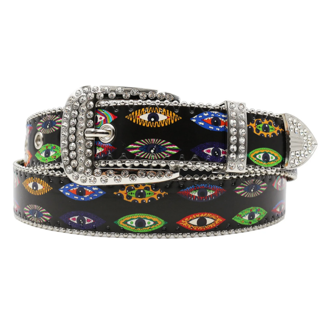 A row of colorful illustrated eyes runs along a glossy black strap, framed by a chunky silver buckle and studded edges that give instant attitude to jeans or dresses. The print feels like doodle art from a sketchbook—bold, a little strange, and perfect for turning a simple outfit into something stage-ready.