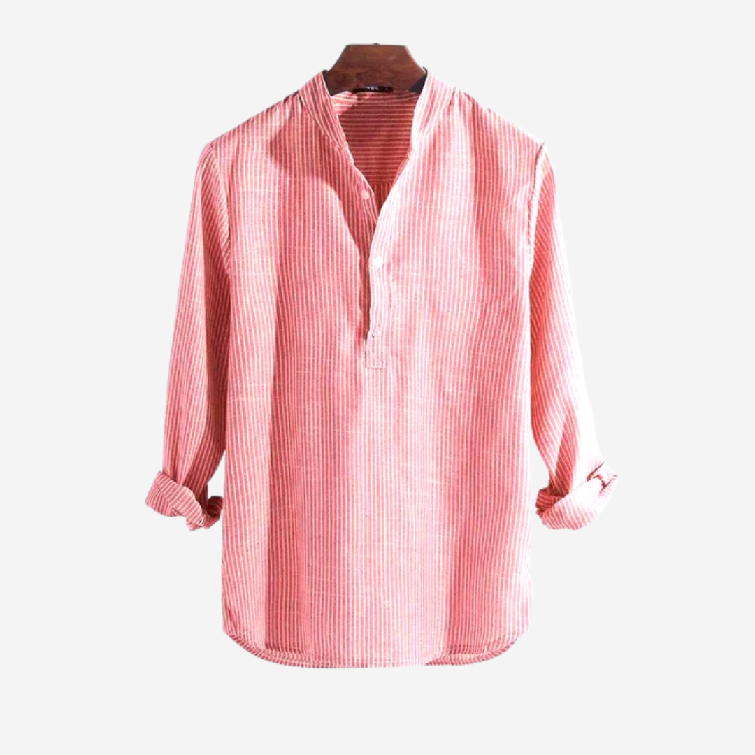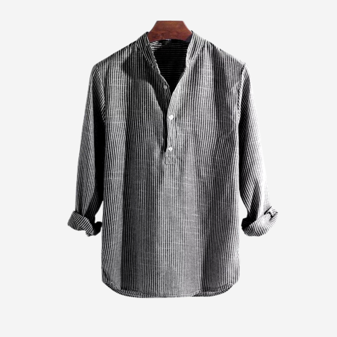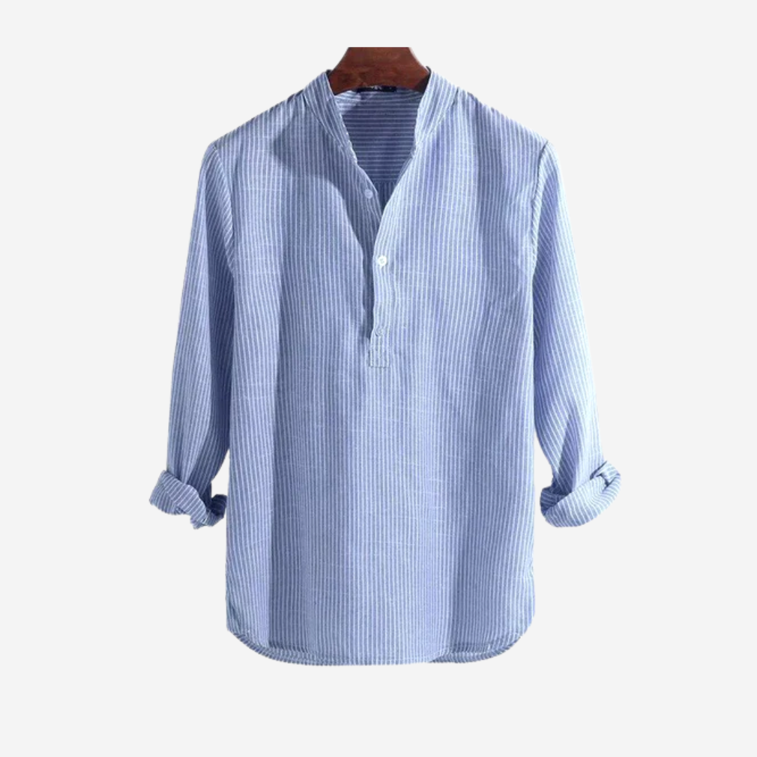 This Tom Carter Striped Linen Shirt is the perfect combination of style and comfort. Crafted from a cotton and linen blend, this shirt is lightweight and breathable for all-day wear. The classic stripes in navy and white are timelessly stylish, and the three-button closure completes the look.