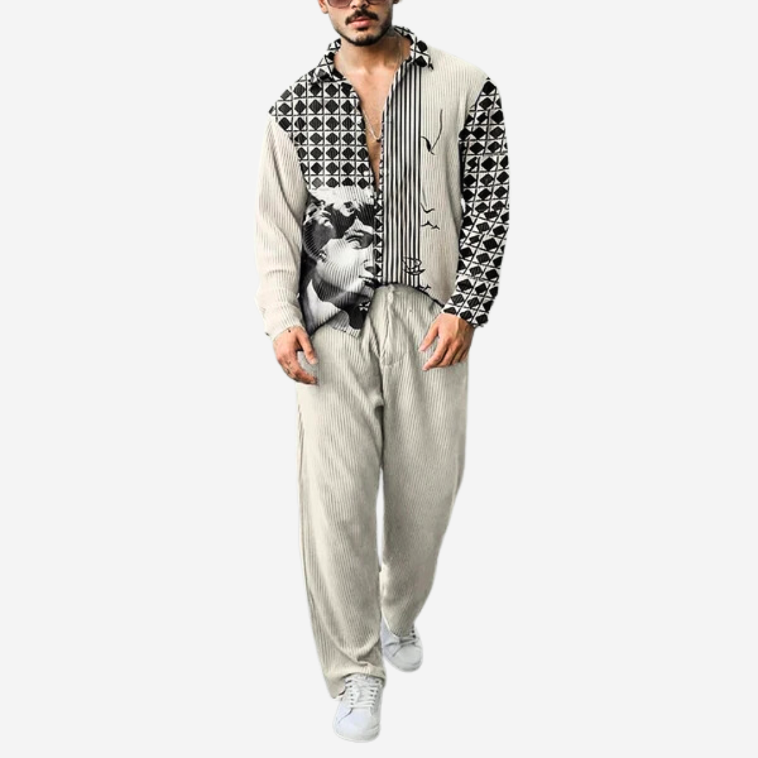 Presenting the Tom Adams Urbane Ensemble Set, an exceptional men's shirt and pants set crafted from high-quality polyester for a comfortable and lasting wear. This unique design seamlessly blends a modern aesthetic with a touch of sophistication, making it the perfect choice for any discerning gentleman.