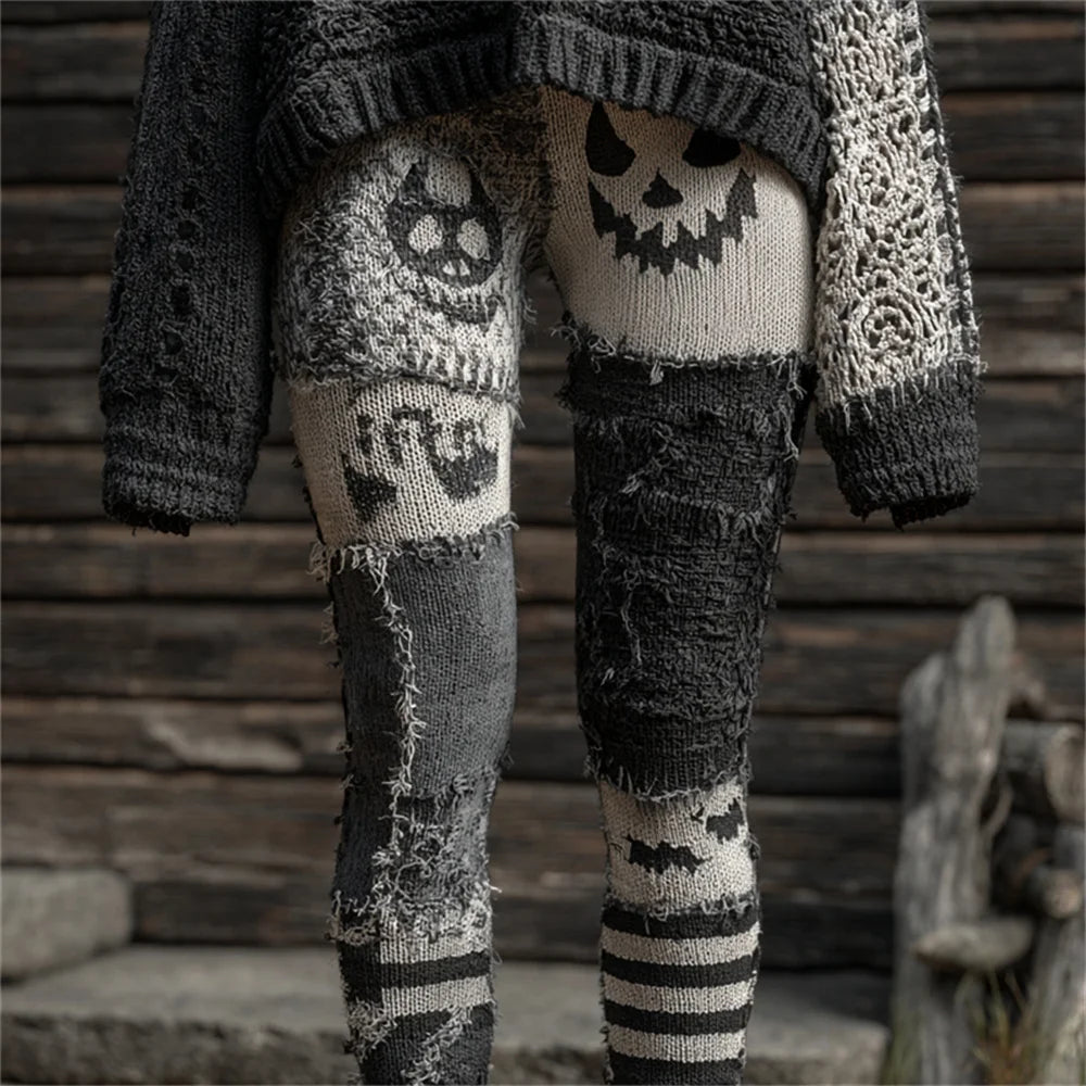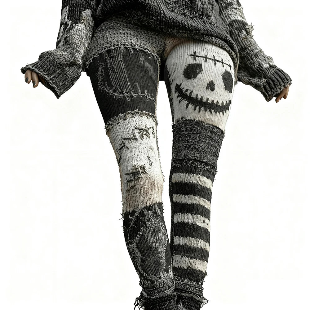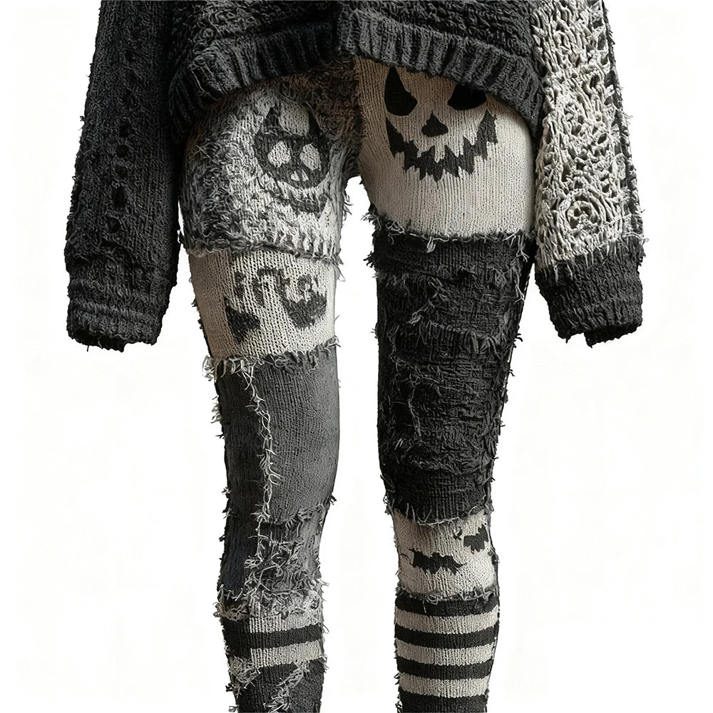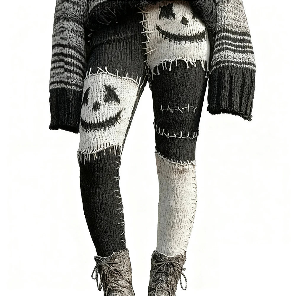 Soft, cozy knit leggings stitched with contrasting panels and a playful “pumpkin/stitched‑face” motif for unmistakable Y2K energy. A slim, high‑stretch fit hugs the legs while the artful patchwork adds texture and attitude.