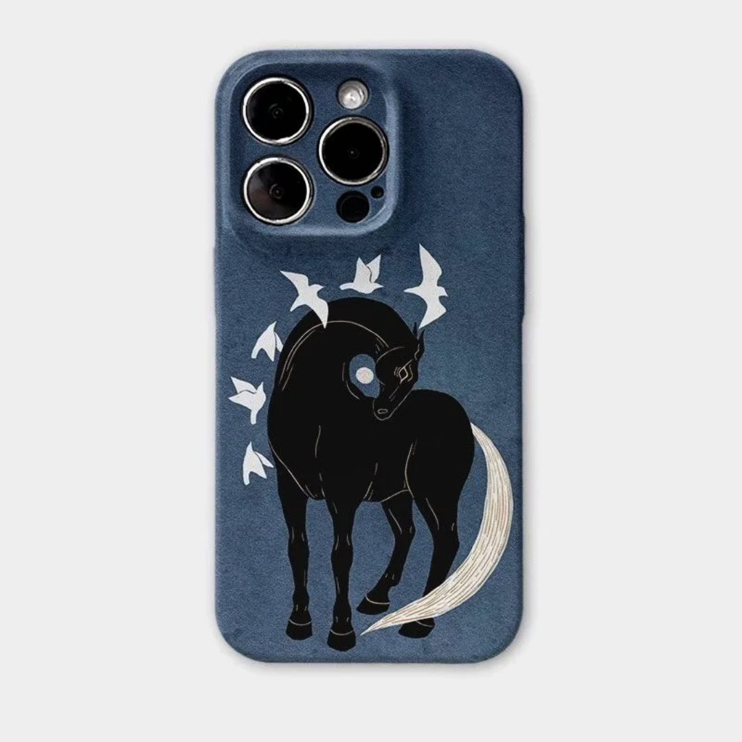 A bold midnight horse surrounded by white birds and a crescent moon is printed onto a soft satin-matte shell, giving the case the look of a tiny art piece in your hand. The smooth surface resists fingerprints while the protective frame wraps the edges and camera with a slim, secure fit.
