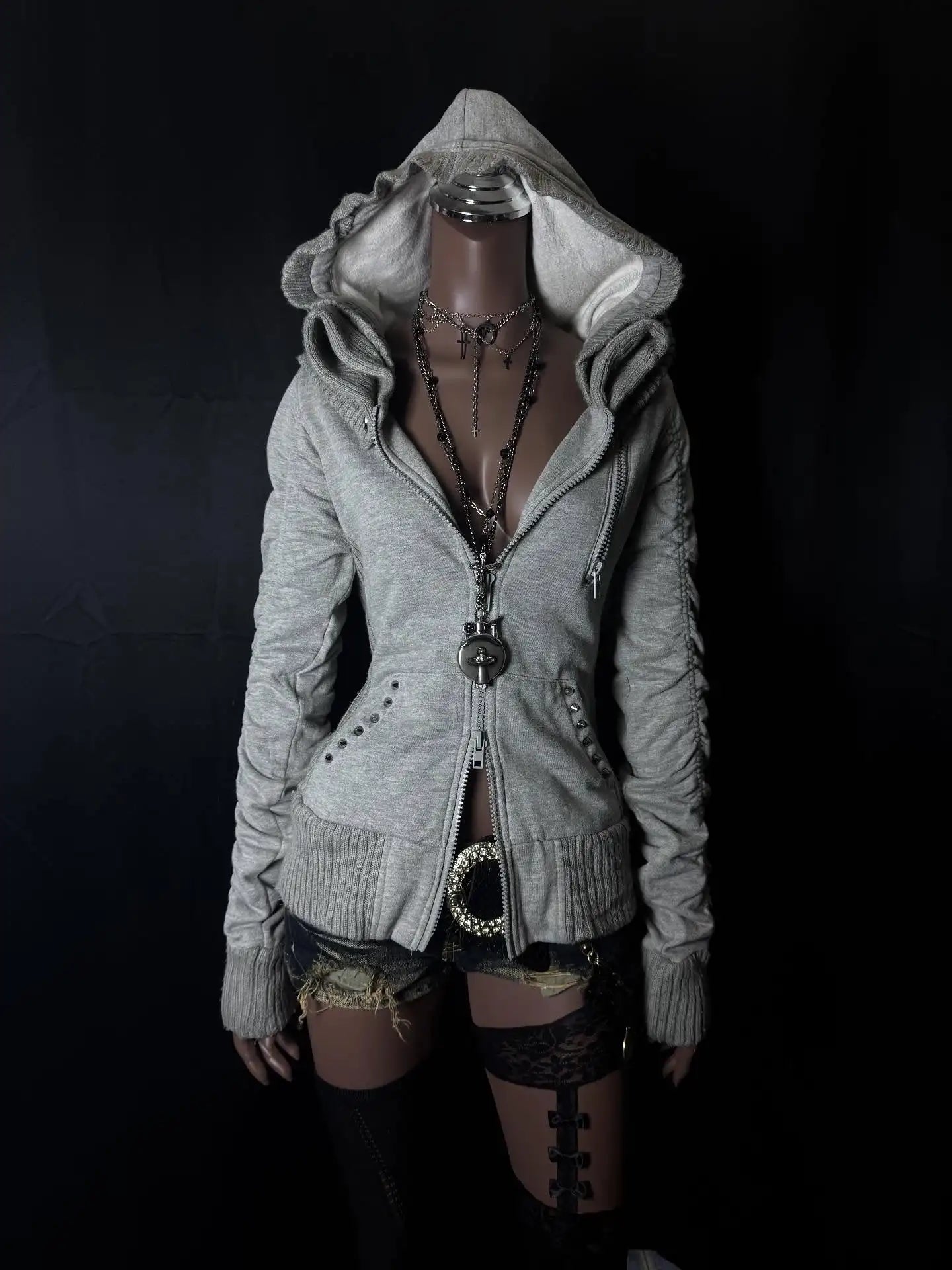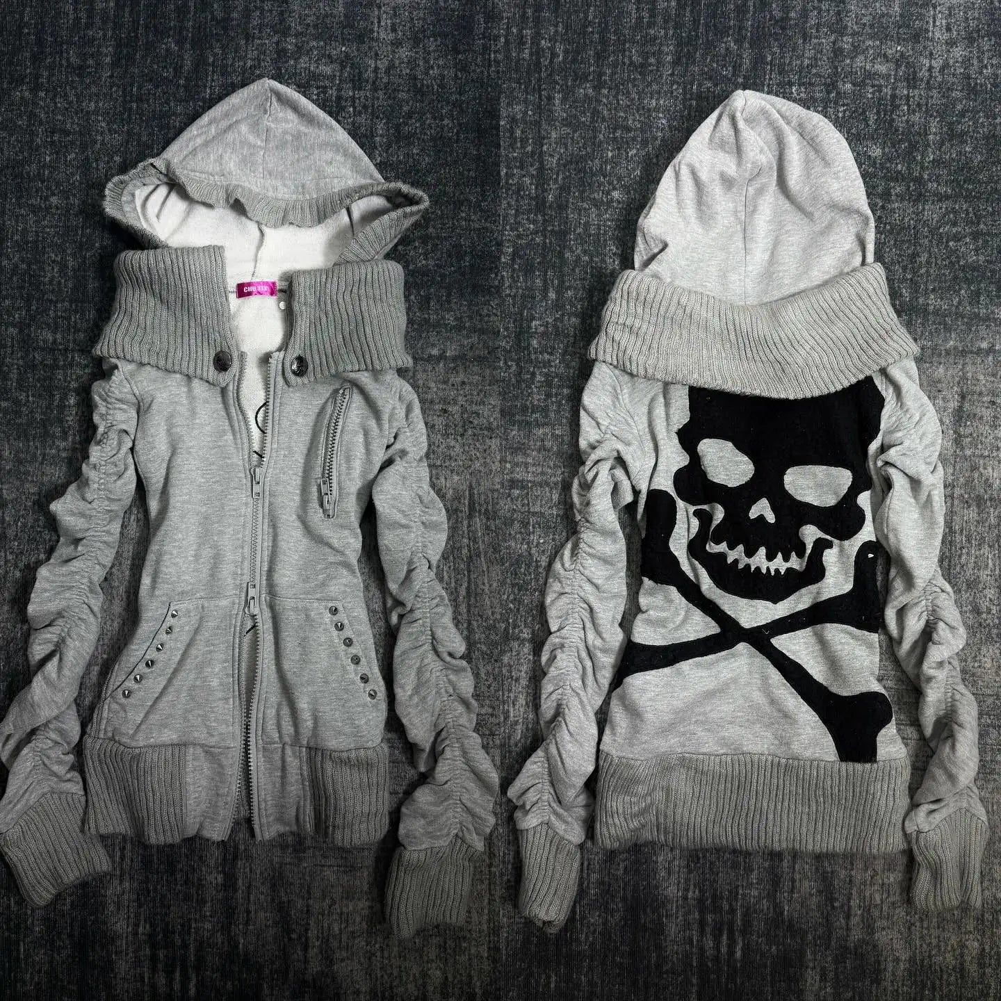 NIGHT VAULT channels goth streetwear with sculpted lines. Cut from soft sweatshirt knit, this slim hoodie features a convertible funnel hood and a double‑zip front for adjustable styling. A bold skull‑and‑crossbones spans the back for a statement finish.
