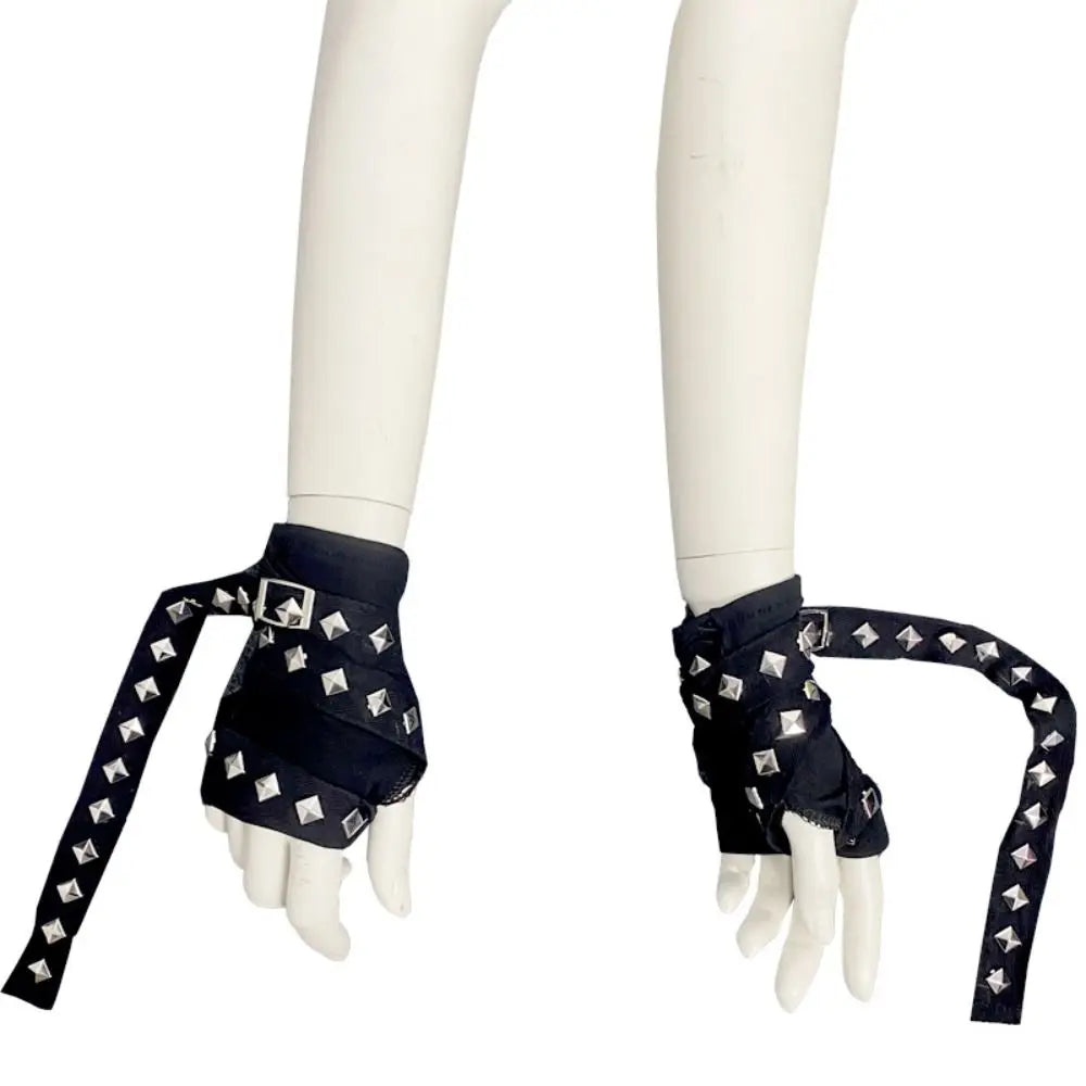 Fingerless knit gloves wrapped with adjustable straps and metal studs for instant punk attitude. Soft, stretchy fabric keeps hands free for your phone while adding edge to any look.