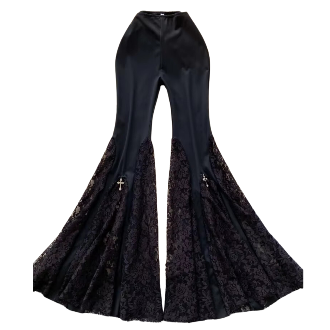 These meticulously crafted pants are made from luxurious black velvet and feature a high-waisted design with a flared silhouette. Lace inserts add a touch of delicate detail.