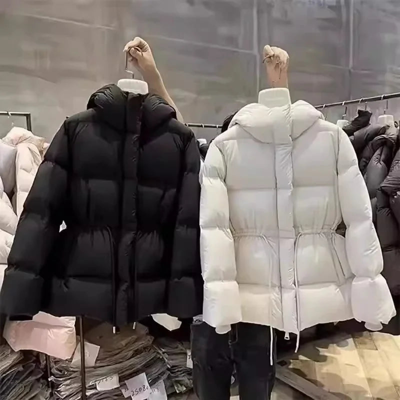 This cinched-waist puffer floats around you like a soft winter cloud, with plush padding that traps warmth while keeping the silhouette feminine and sculpted. The waterproof outer shell has a buttery-smooth touch, and the oversized hood frames the face beautifully for cold-morning commutes and night-out winter fits.