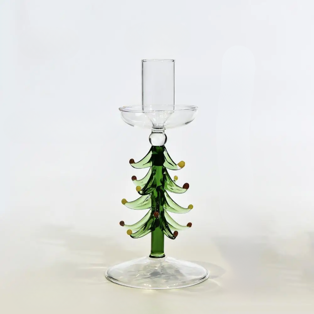 Slender borosilicate stems shape into tiny Christmas trees, then lift your tapers above the table with a warm, crystalline glow. The clear foot keeps surfaces safe while festive green trunks sparkle in candlelight.