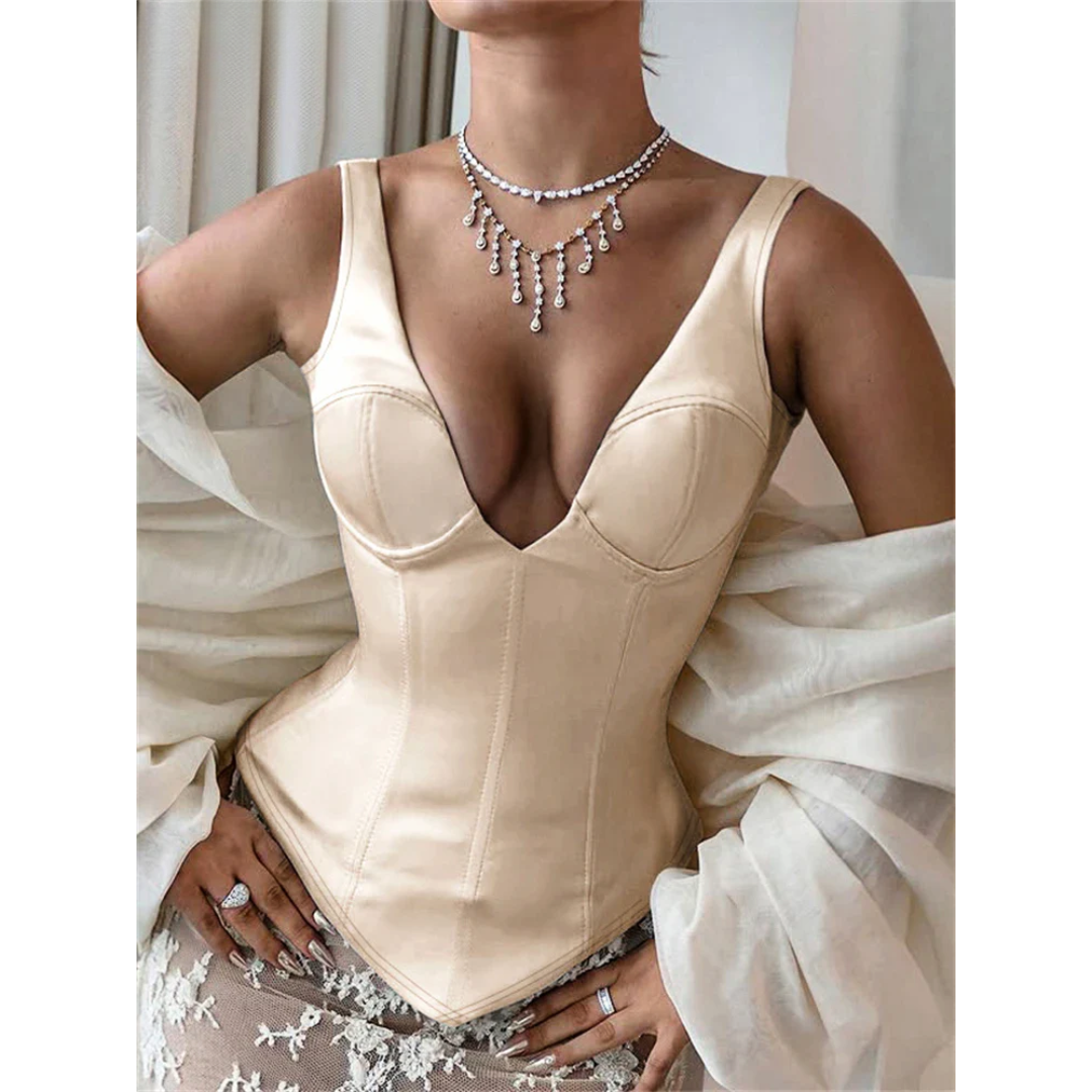 Cut to sculpt and shine, the Luna Corset is tailored from liquid‑satiny fabric with a deep V bust, contoured cups and clean boned seaming that carves the waist. A curved hem skims the hip, while a hidden back zip keeps the profile sleek—elevating everything from denim to slip skirts.