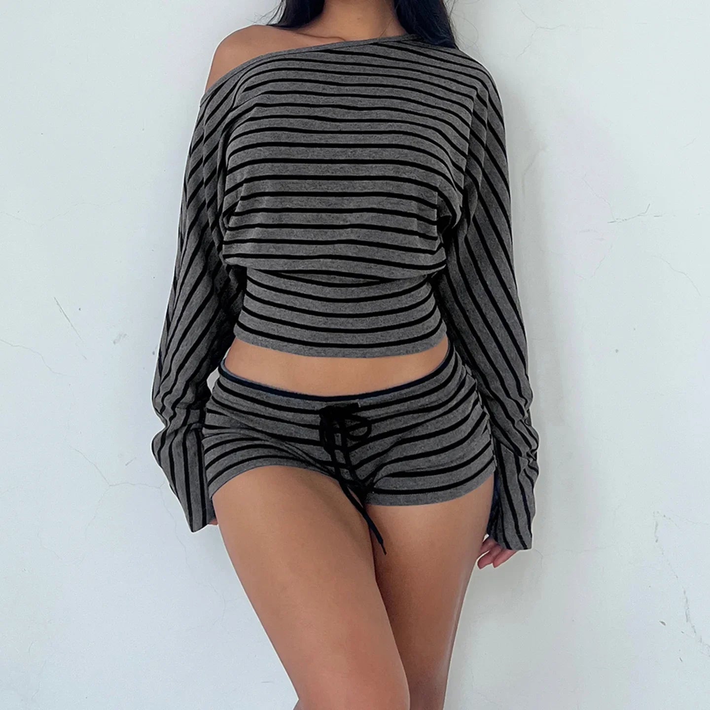 A striped two-piece set featuring an off-shoulder long sleeve top and matching fitted shorts. Designed to contour the body while keeping stretch comfort for casual wear.