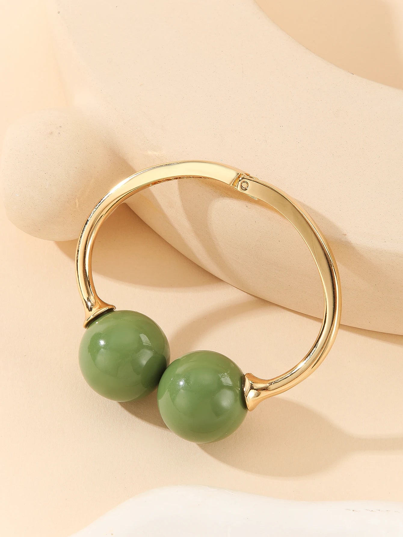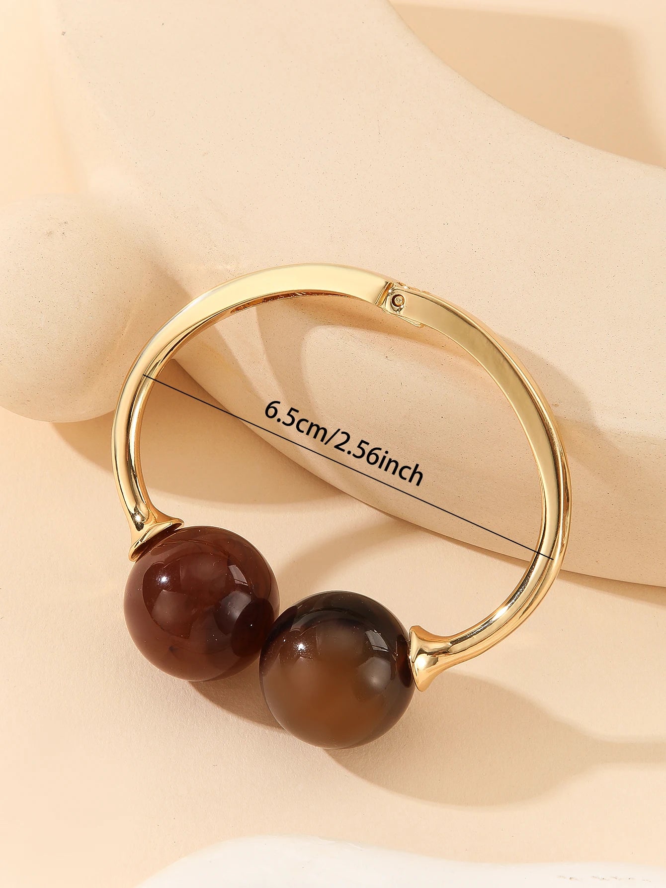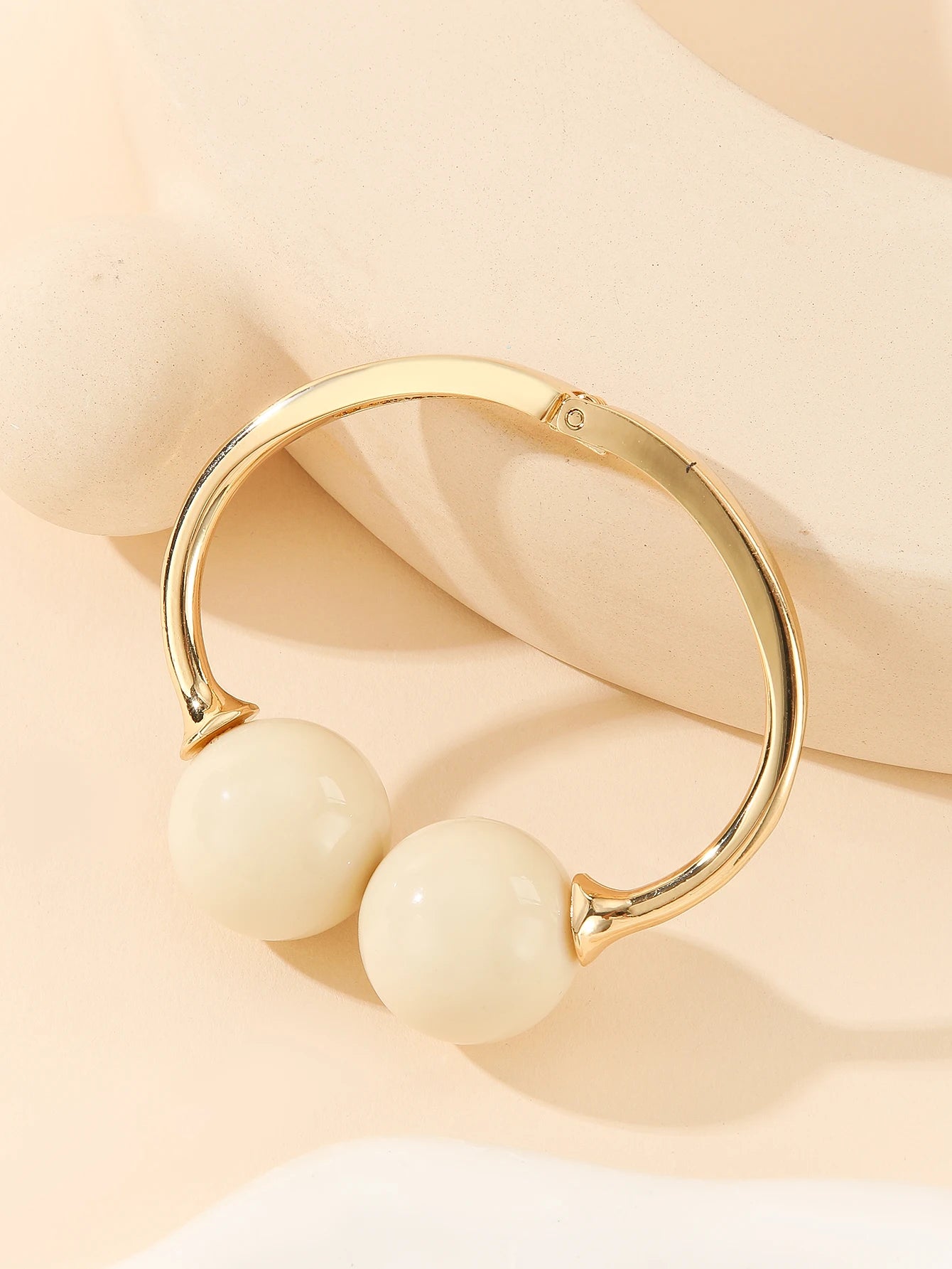 A smooth open bangle curves around the wrist, finished with two polished acrylic spheres that catch the light and add a sculptural, modern touch. Its adjustable silhouette makes it easy to layer with other pieces while still standing out as a clean, artistic accent.