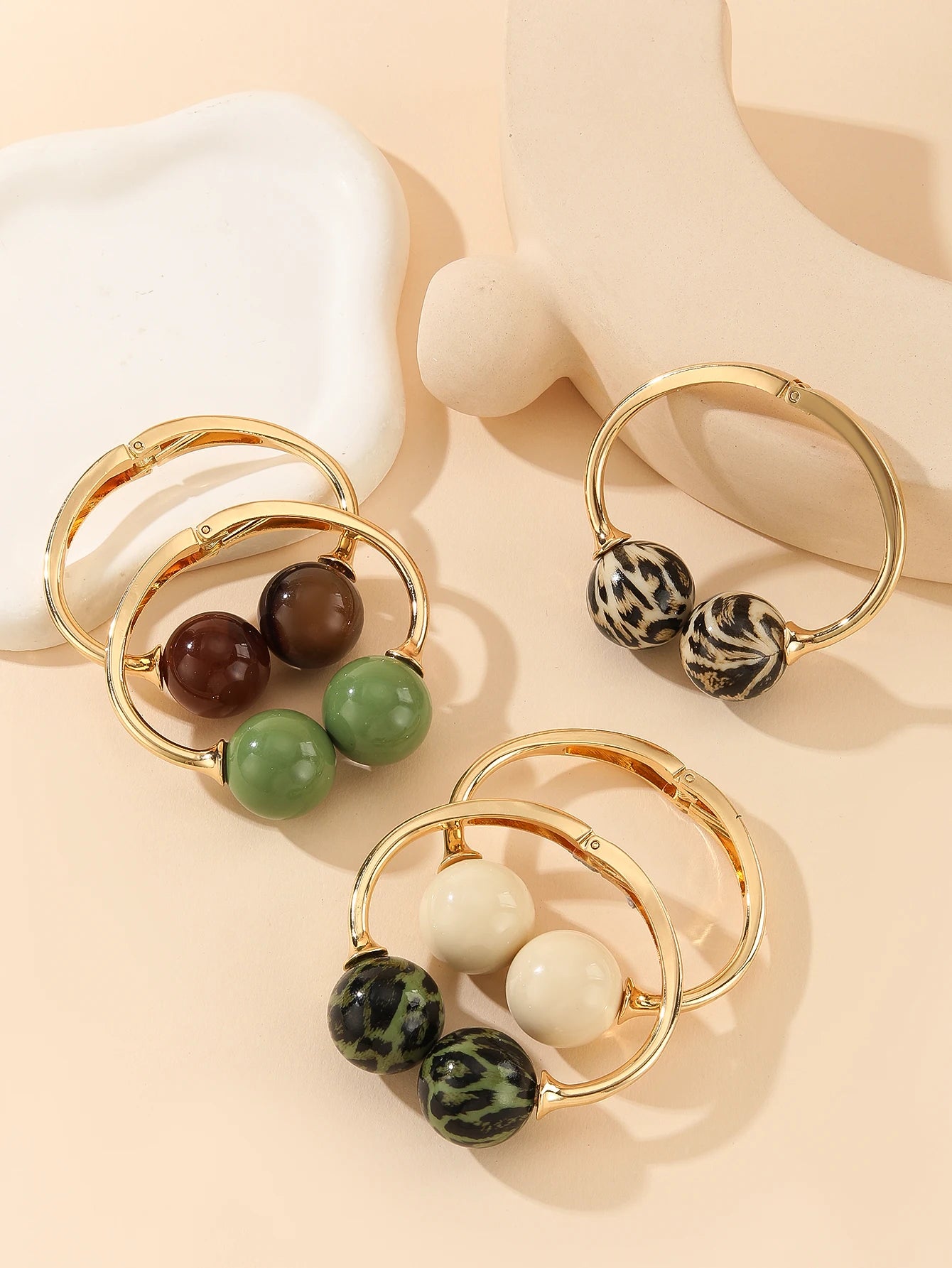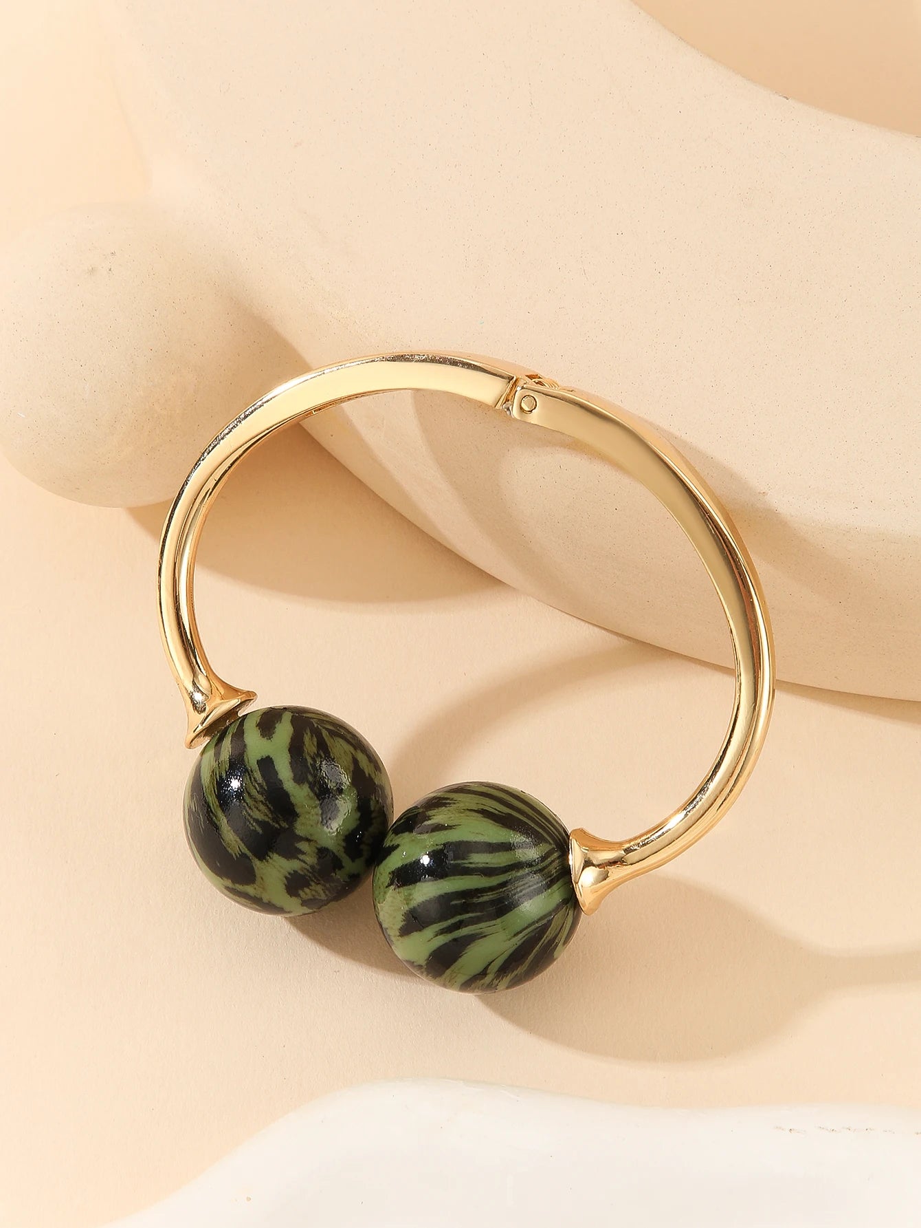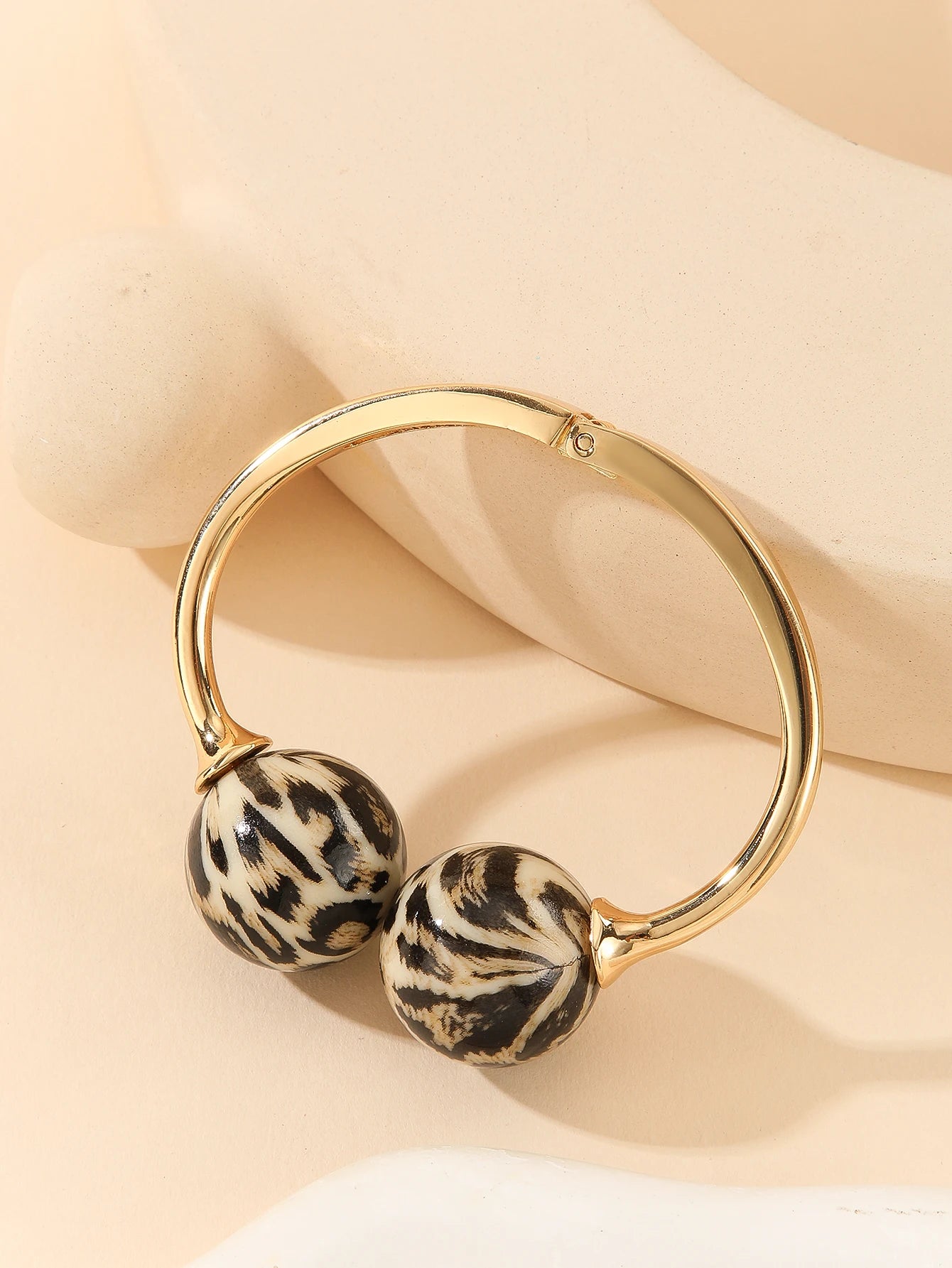 A smooth open bangle curves around the wrist, finished with two polished acrylic spheres that catch the light and add a sculptural, modern touch. Its adjustable silhouette makes it easy to layer with other pieces while still standing out as a clean, artistic accent.