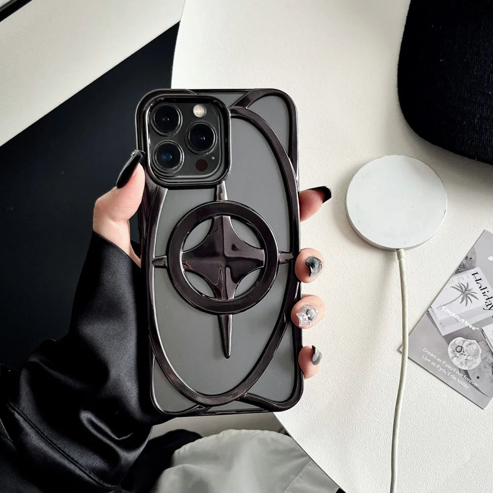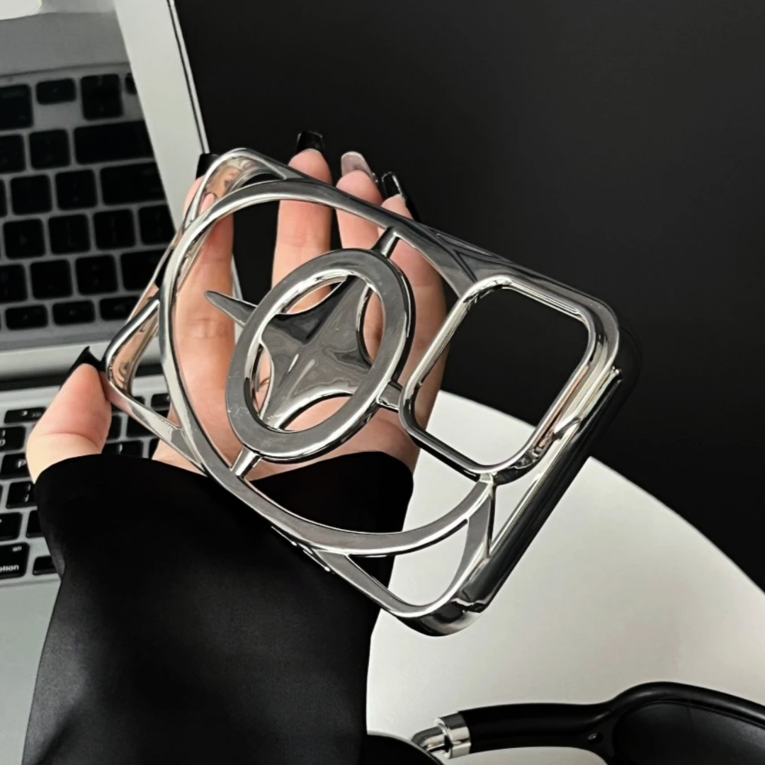 Mirror‑plated TPU is sculpted into an open‑frame constellation, with a polished 3‑D star floating on a MagSafe‑ready ring—minimal surface, maximum shine. Your iPhone looks weightless, yet a hidden shock lattice and precision bevels still guard every edge.