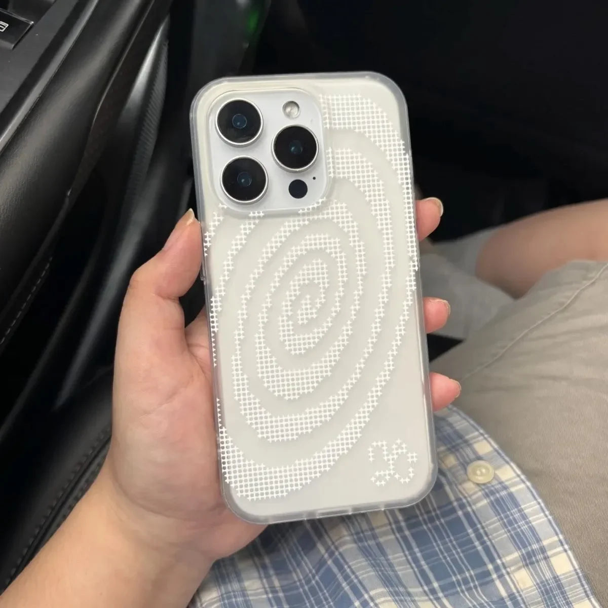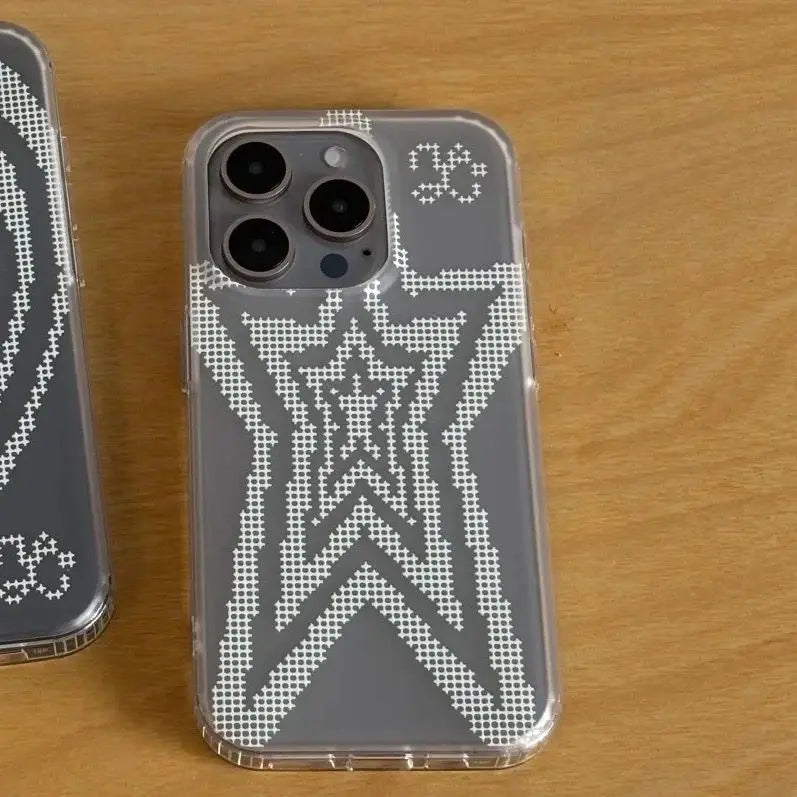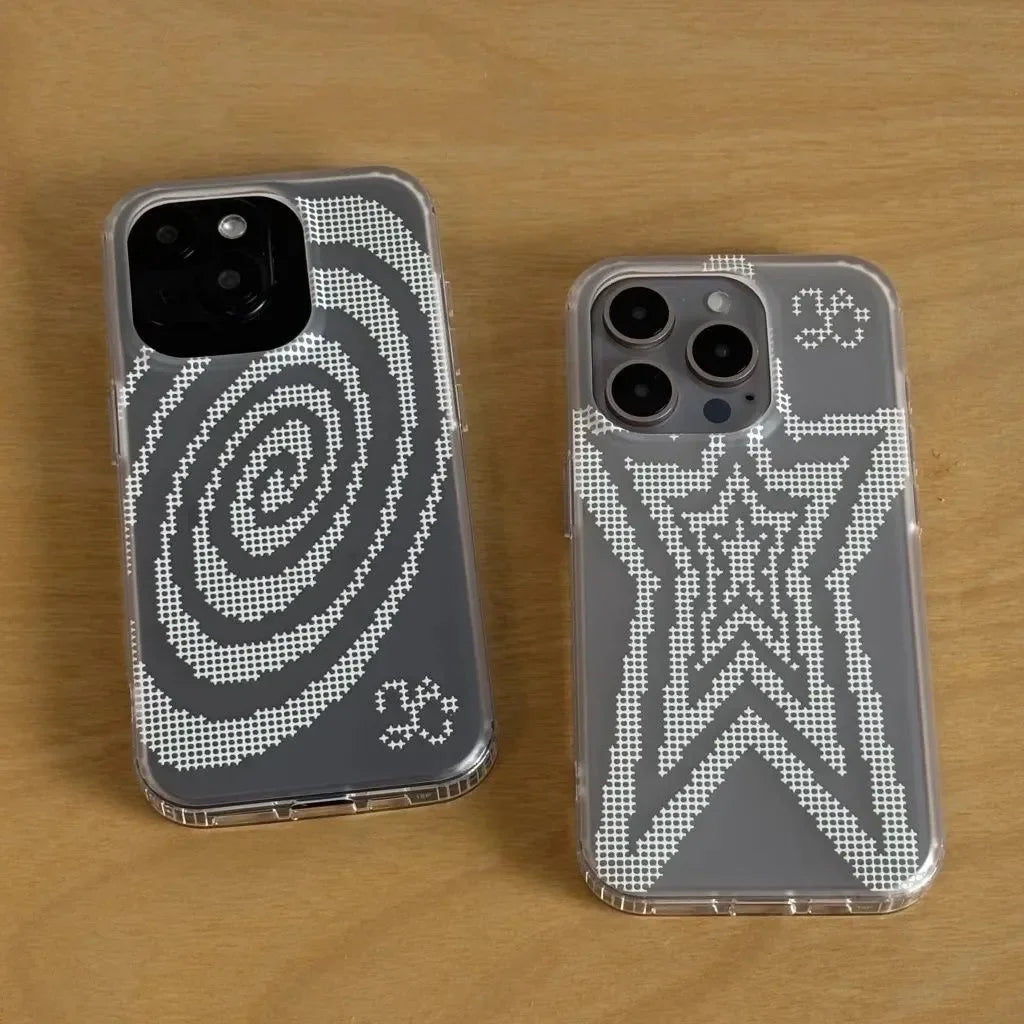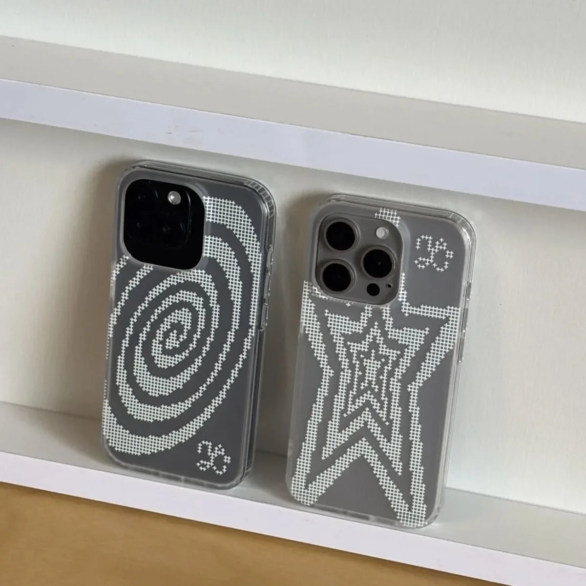 A frost‑clear shell carries pixel‑dot constellations—choose hypnotic spiral or radiant star—etched under a silky, non‑slip matte glaze that lets your iPhone’s colour glow through while a feather‑slim bumper keeps drops discreetly handled.