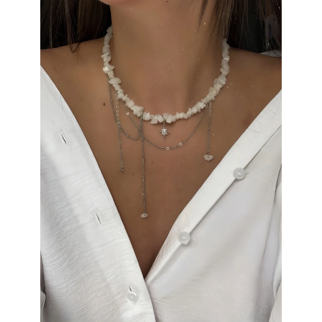 River-tumbled stone chips wrap the neckline in a soft, uneven collar, leading down to a tiny songbird and airy chain fringe that sways with every step. Earthy tones and delicate metalwork make it an easy layer over tees, silk camis, or knits, catching light without feeling too shiny.