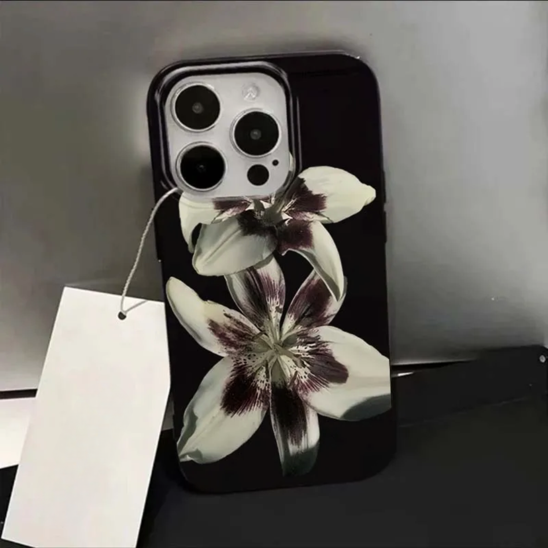 Midnight silicone cradles a photo‑real ivory orchid, sealed beneath a satin‑gloss coat that feels like lacquered glass yet flexes on impact.