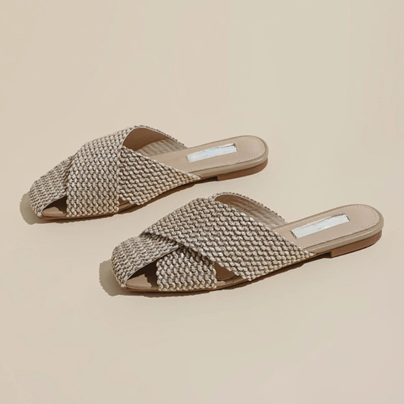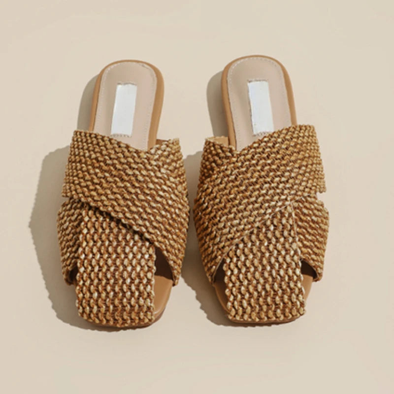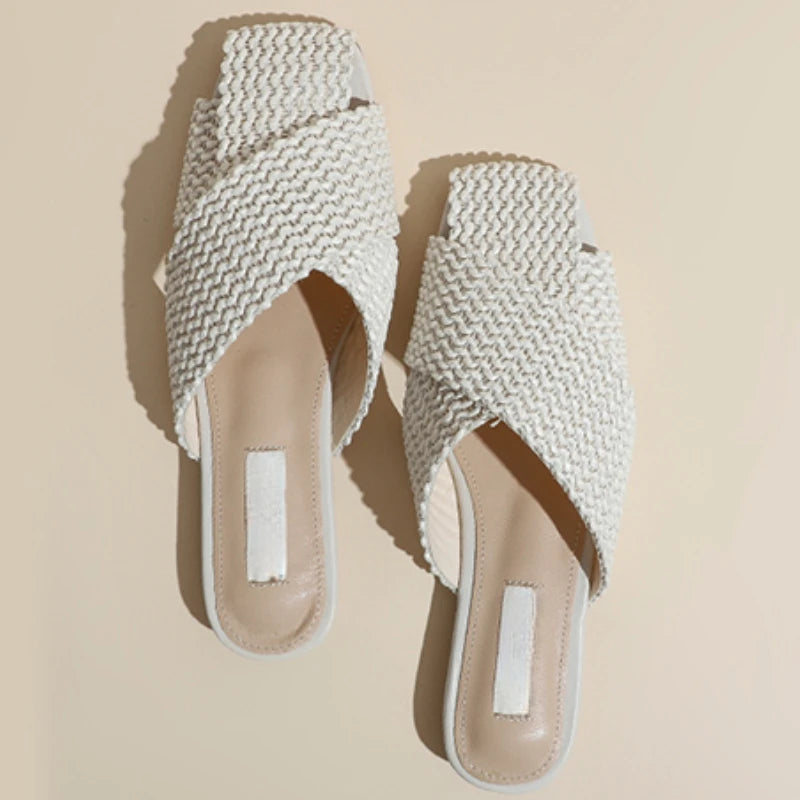 Hand‑woven raffia‑textured straps cross a sculpted square toe, framing the foot with easy Riviera polish. Beneath, a high‑rebound memory‑foam footbed and silky micro‑suede lining cradle every step, while the feather‑light outsole glides silently from marble lobby to moonlit patio.