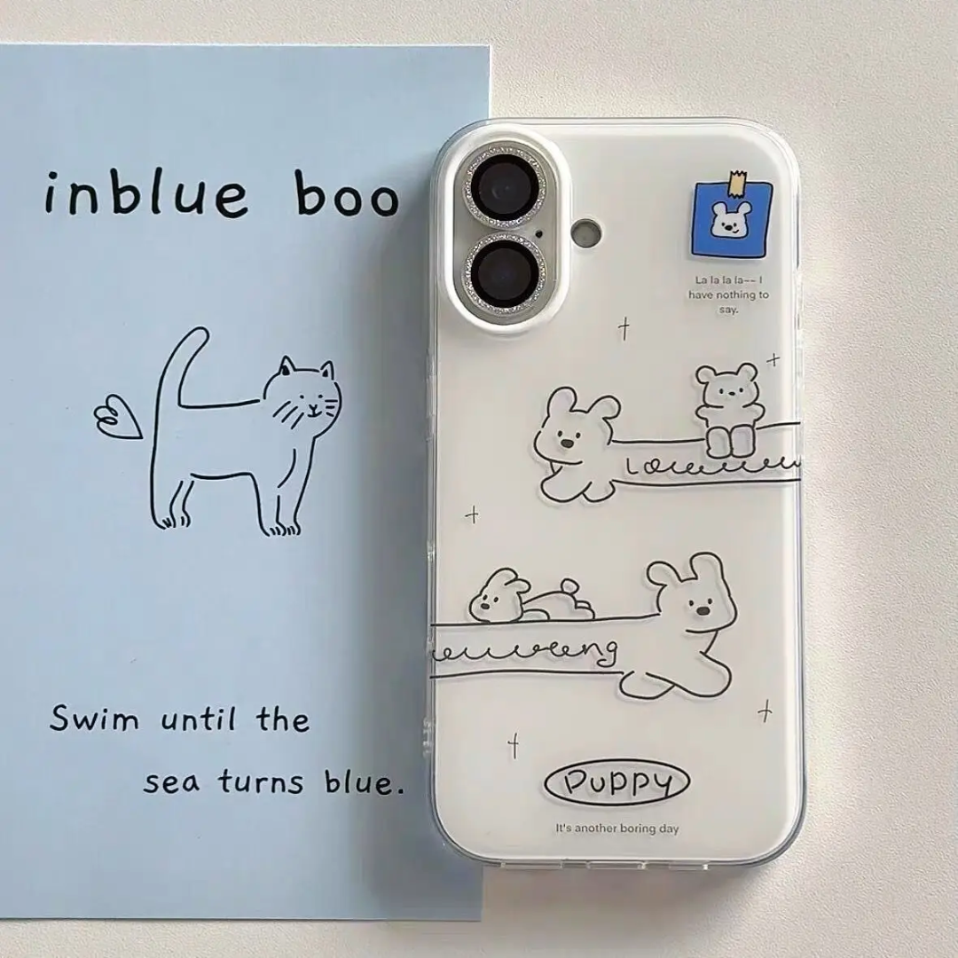 Clean hand‑drawn pups glide across a crisp white shell with airy negative space that makes your phone feel lighter and fresher. Flexible edges snap on fast while raised bezels guard the screen and camera from everyday bumps.