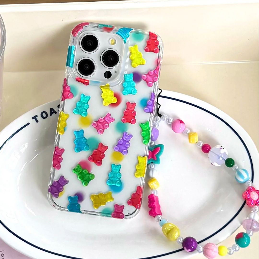 Multicolor gummy‑bear motifs pop against an iridescent gloss, while the slim shell wraps edge to edge and stays pocket‑friendly. A matching beaded lanyard clips on for hands‑free carry; raised bezels add everyday protection.