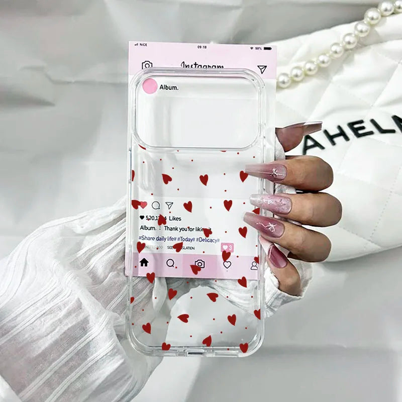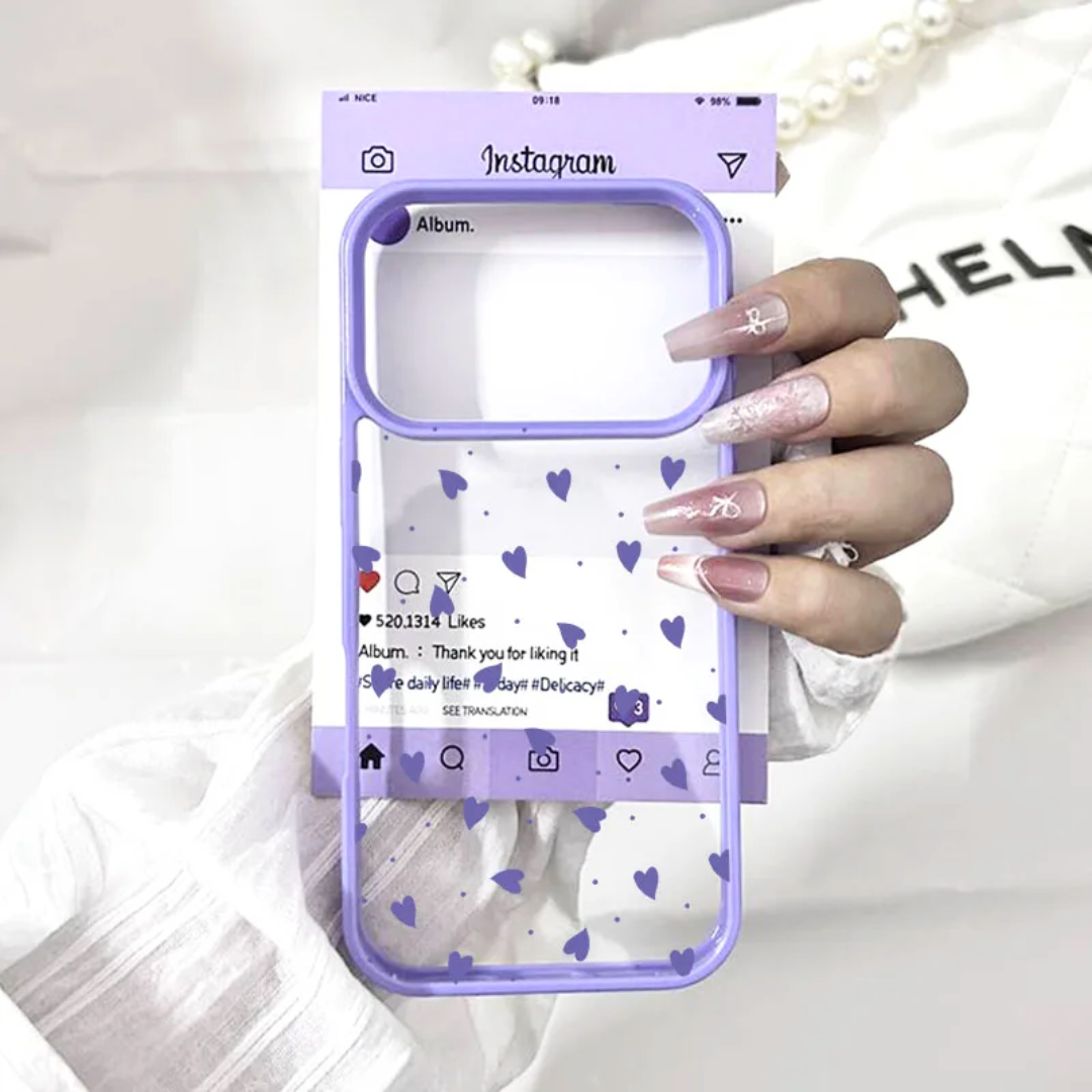 Tiny hearts float over a clear base framed in soft pink, purple, or blue, with a printed “social feed” border that makes your phone look like a live screenshot. The hard back and smooth bumper keep the design crisp while giving solid everyday protection.