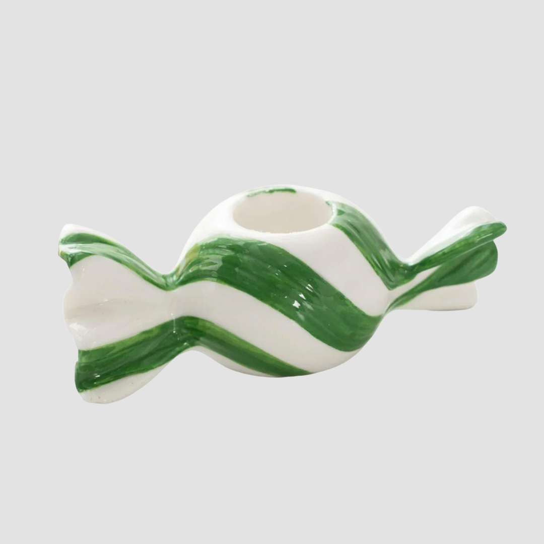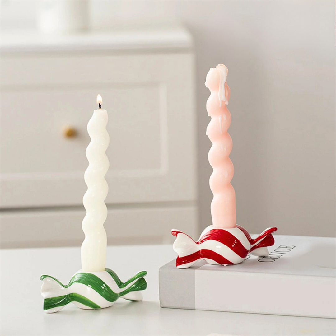 Hand‑shaped like a wrapped candy, this glossy holder catches the glow and turns any mantel into a holiday vignette. The curved “ribbon” ends cradle your taper while the striped body gleams like confectionery glass.