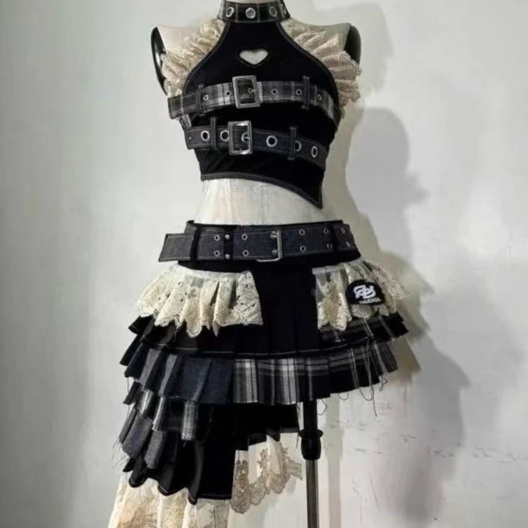 Delicate patchwork lace meets edgy buckle detailing, creating a seductive silhouette that fuses gothic romance with avant-garde flair. From its form-fitted top to the cascading mini skirt, every element promises an unapologetically bold statement for summer nights and beyond.