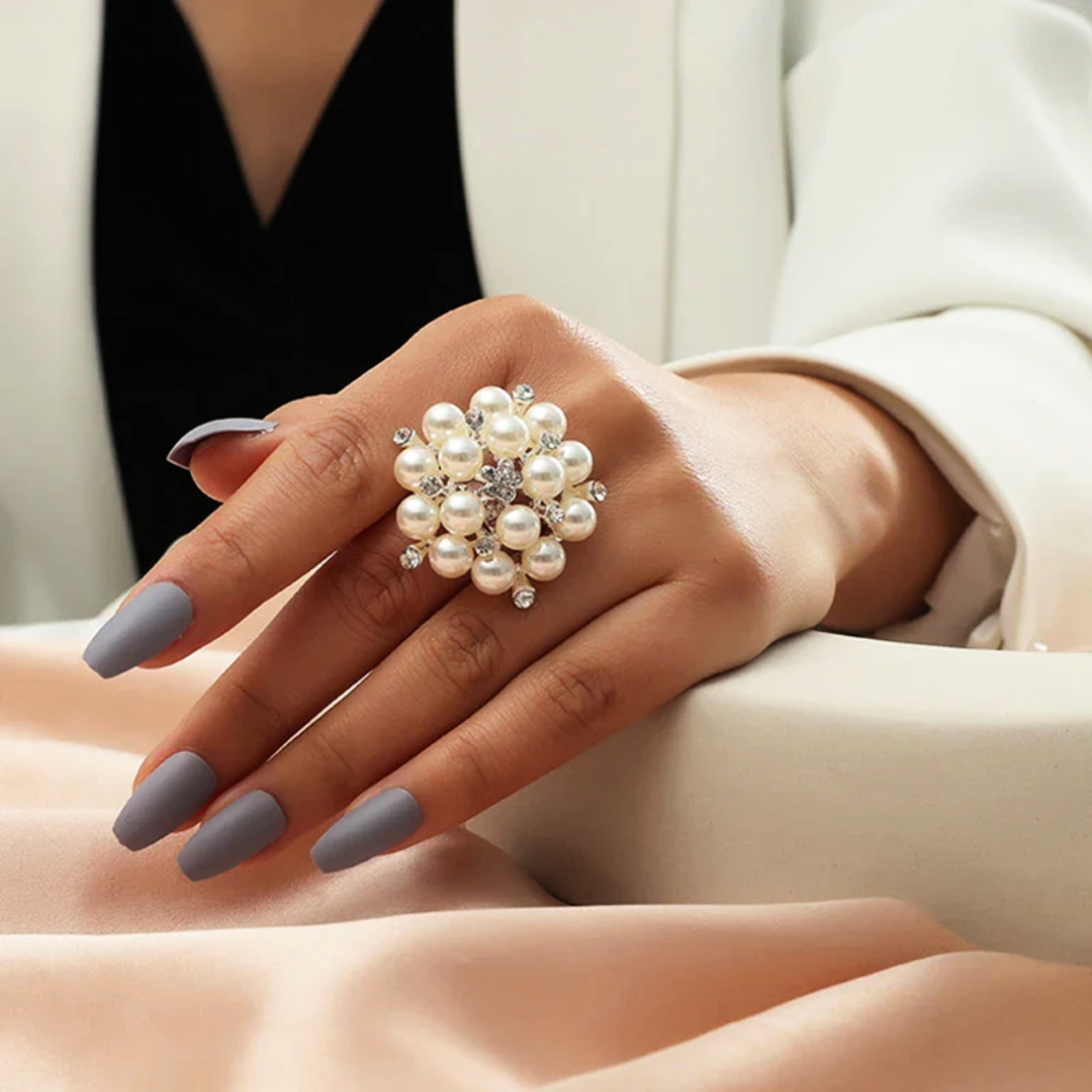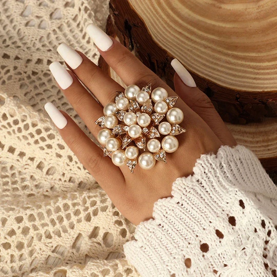 This playful piece features a floral design crafted with care, using faux pearls and rhinestones to create a look that's both eye-catching and affordable. Perfect for adding a bit of sparkle to your everyday outfits or as a fun accessory for special occasions.