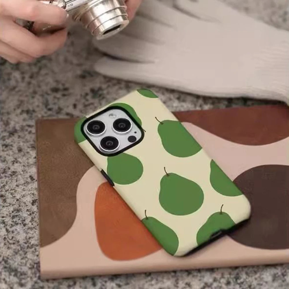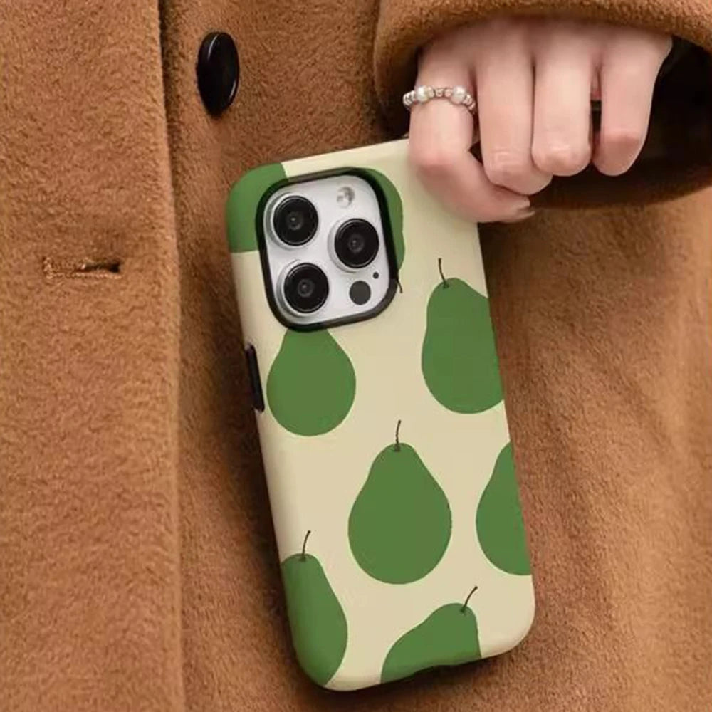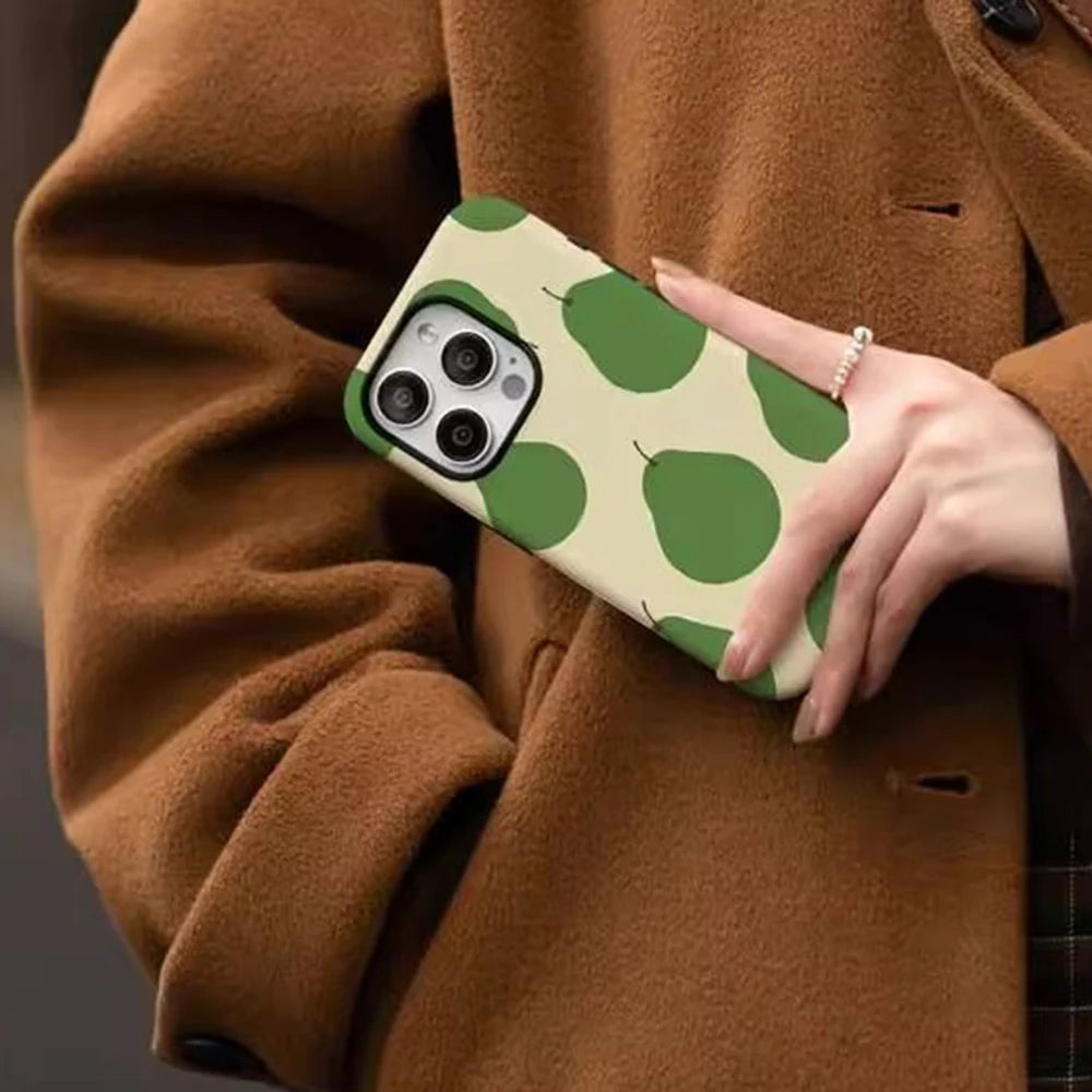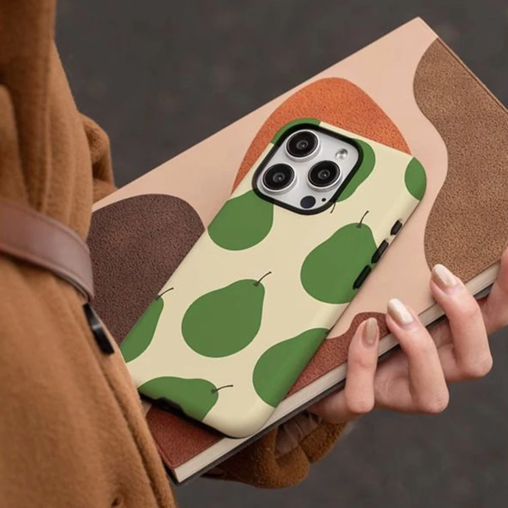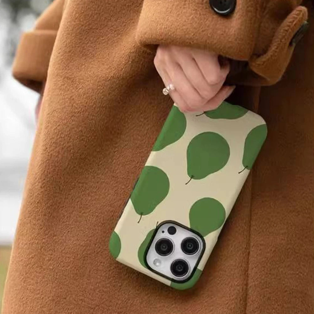 Turn your phone into a little objet d’art with Poire, a creamy ground sprinkled with painterly green pears and a soft–touch finish. The slim, double‑layer shell hugs the device with raised bezels for camera/screen lift while keeping the profile chic and pocket‑ready.