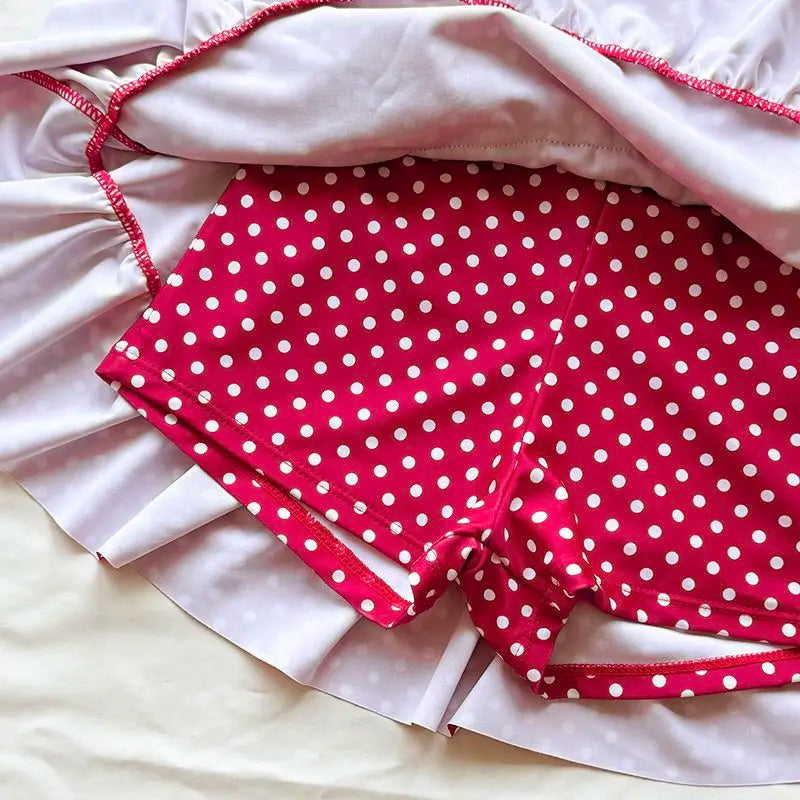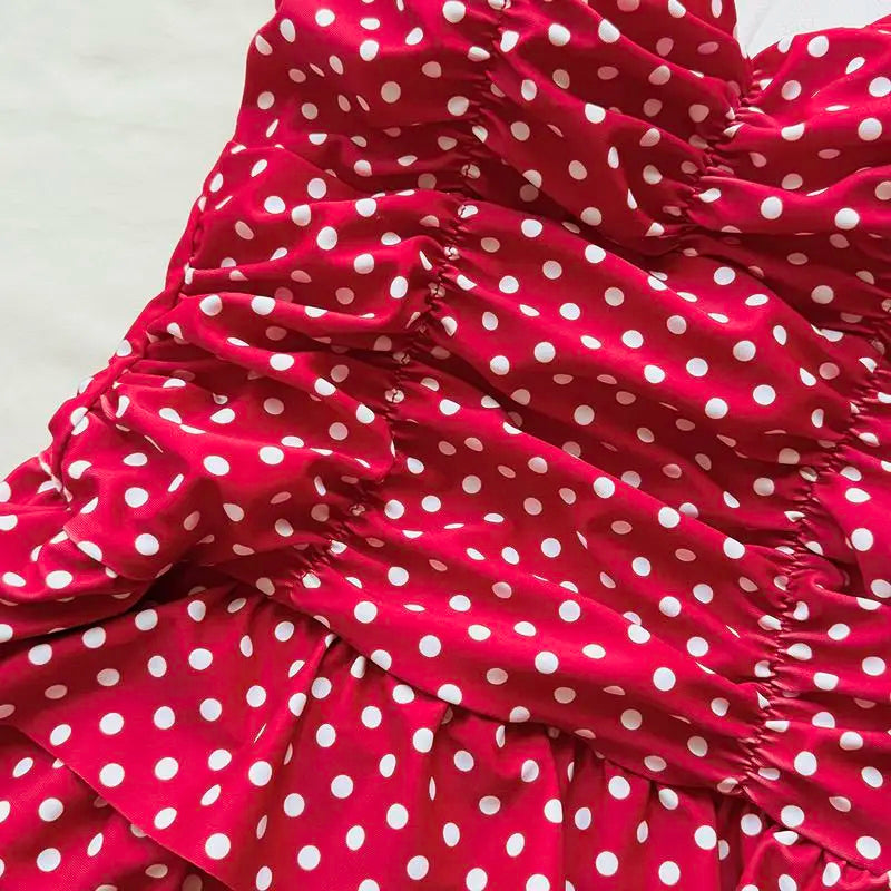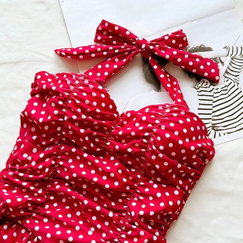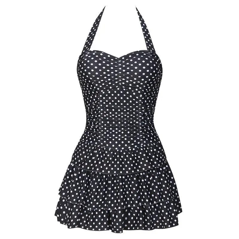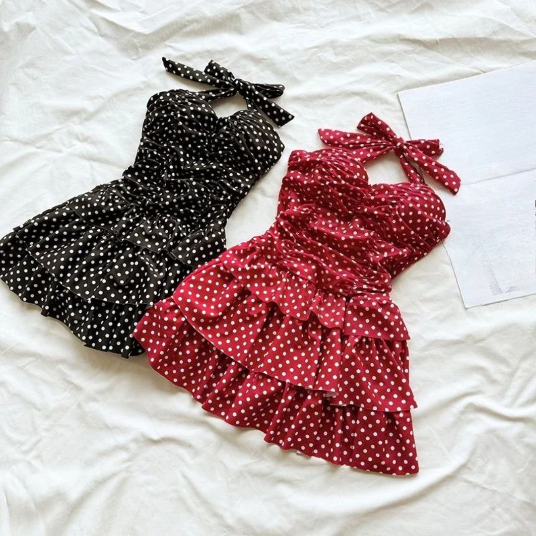 Retro polka dots with a bow neckline and layered ruffle skirt that moves when you walk. Flirty, playful, and perfect for sunny days or beach nights.