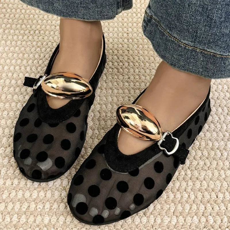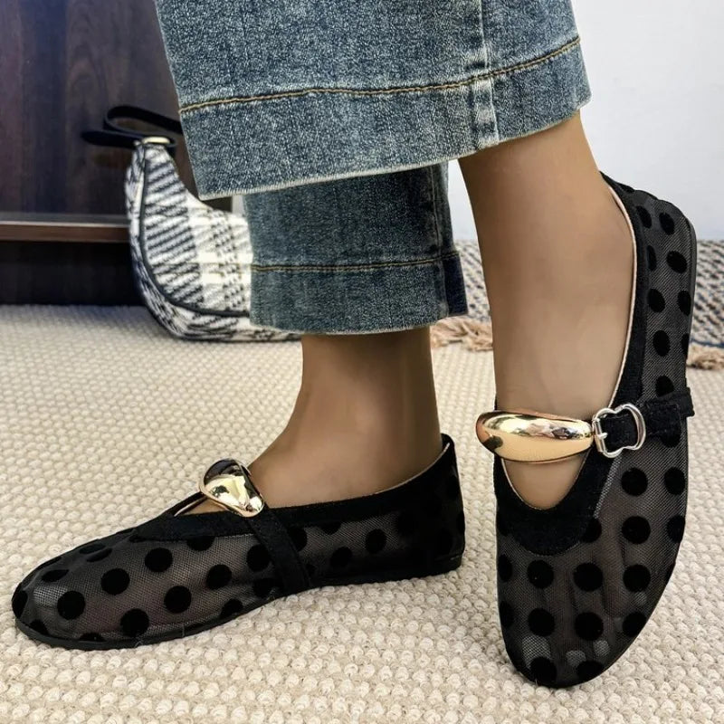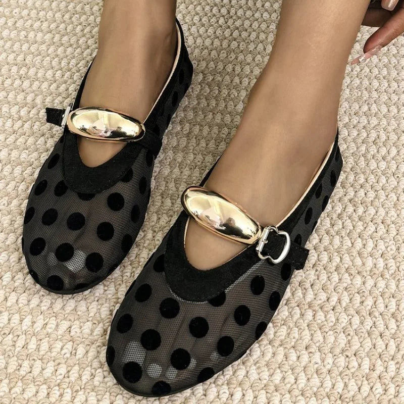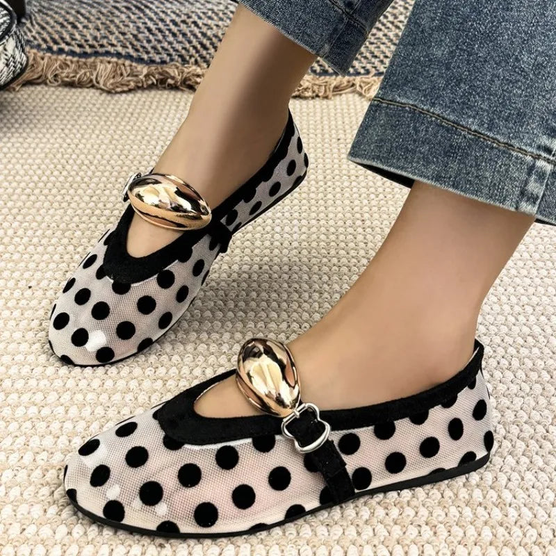 Classic Mary Jane flats finished with a bold polka dot pattern and rounded toe silhouette. Designed with a breathable upper and flexible sole for daily wear.