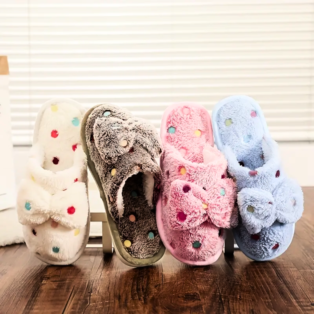 These ultra-plush, furry slippers will whisk you away to a world of comfort and whimsy. With their playful polka dot pattern and adorable bow accent, these slippers are a treat for your feet and a delight for your eyes.