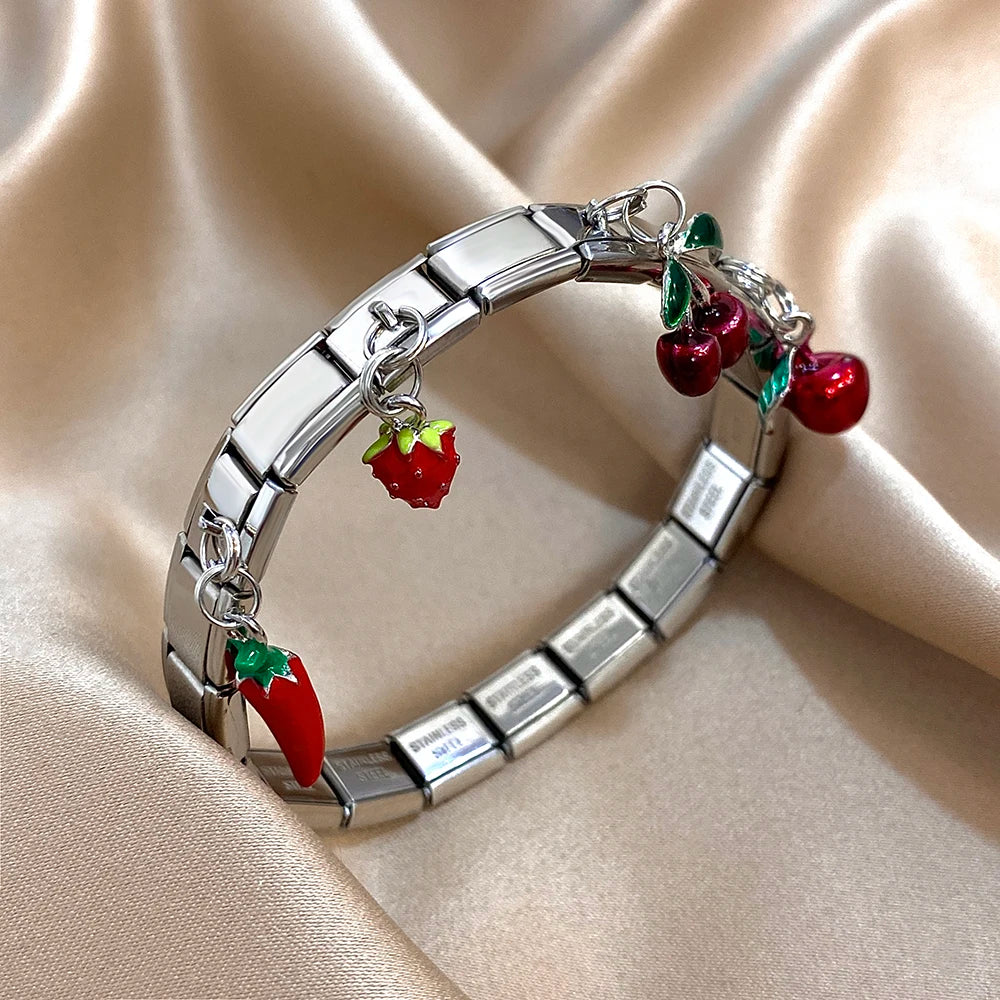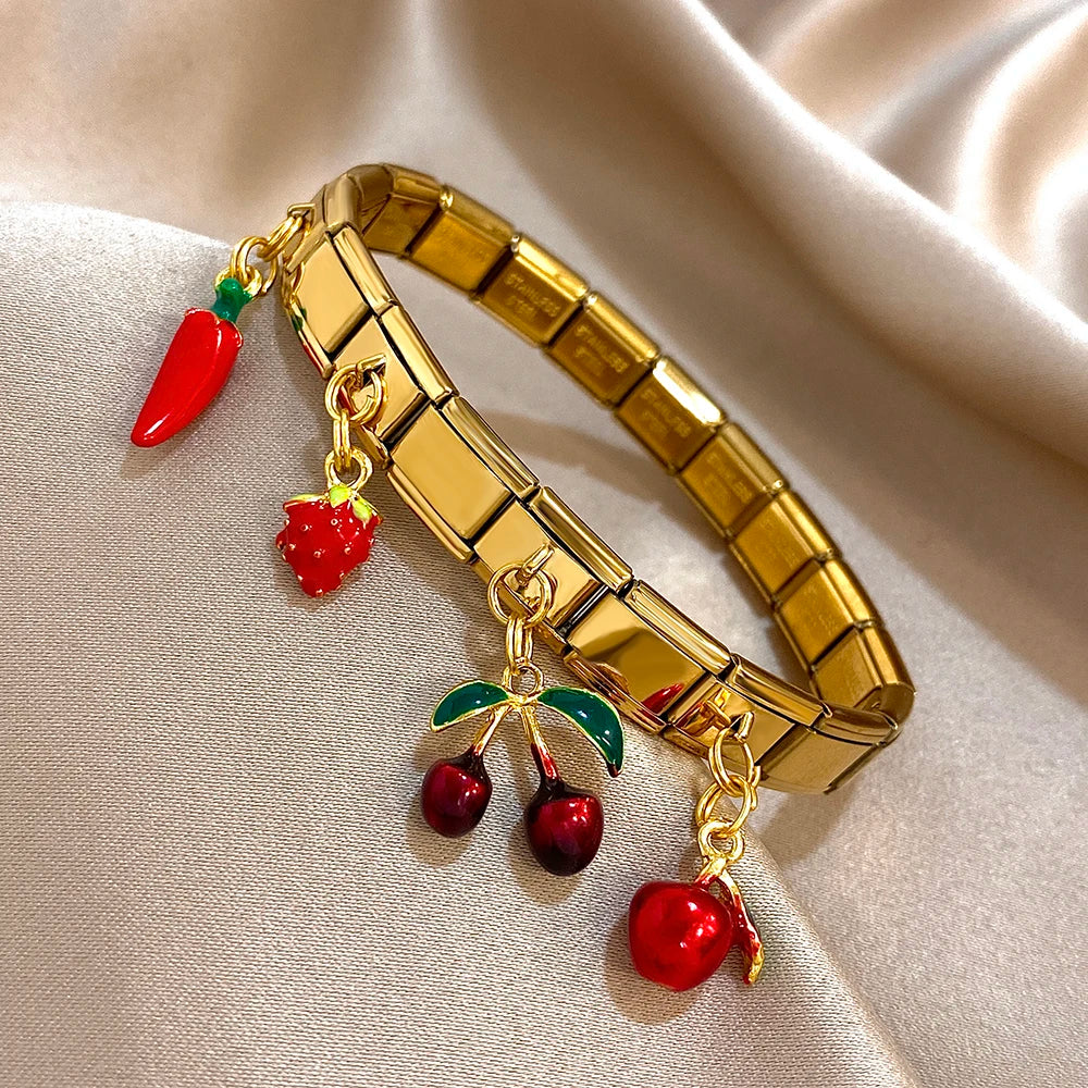 Crafted from lustrous, stainless steel, its vibrant charms—cherries, strawberries, and apples—dangle in playful harmony. Waterproof and stretch-friendly, it delivers a sweet statement that transitions effortlessly from brunch dates to evening soirees.