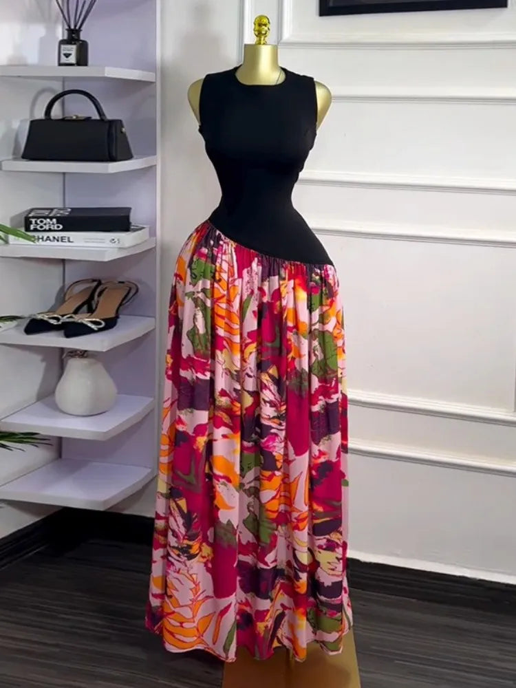 A column-skimming, sleeveless maxi that merges sunrise palms, mosaic tiles, and soft ombrés into one seamless print. Crew neck, invisible side zip, and a discreet stretch panel shape the waist; the hem grazes the floor for an easy, pool-soft drape.