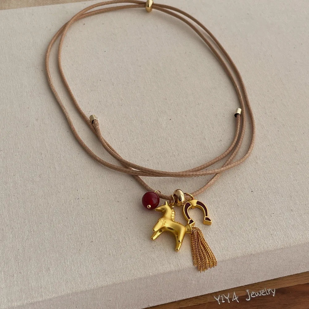 A playful layer you’ll reach for daily. Prairie Nova strings a wax‑cord necklace with a mix of charms—pony, horseshoe, feather and bead—for an effortless, Western‑tinged finish. Slide the knots to wear it choker‑short or long and loose; choose warm gold‑tone or cool silver‑tone pendants.