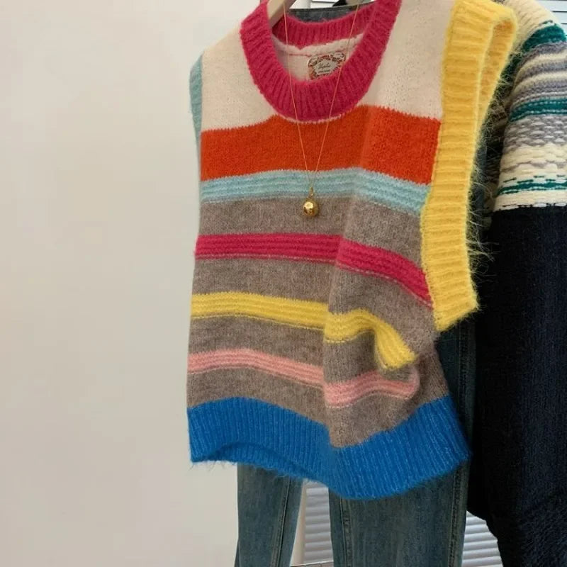 An elevated layer with gallery-bright bands of color and a softly brushed hand. Cut with a relaxed, boxy drape and finished with ribbed trims, it slips over tees, shirts or slip dresses for an instantly polished, downtown look.