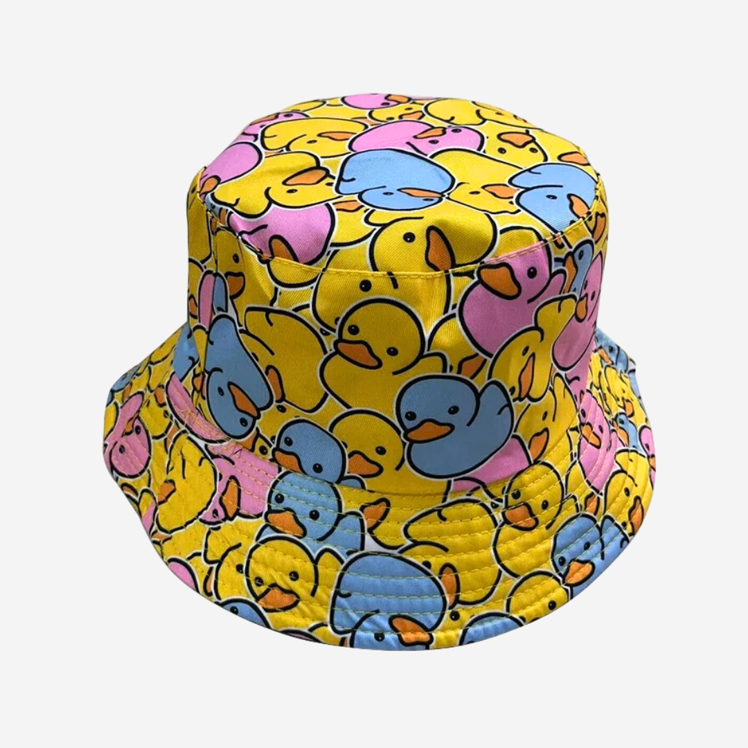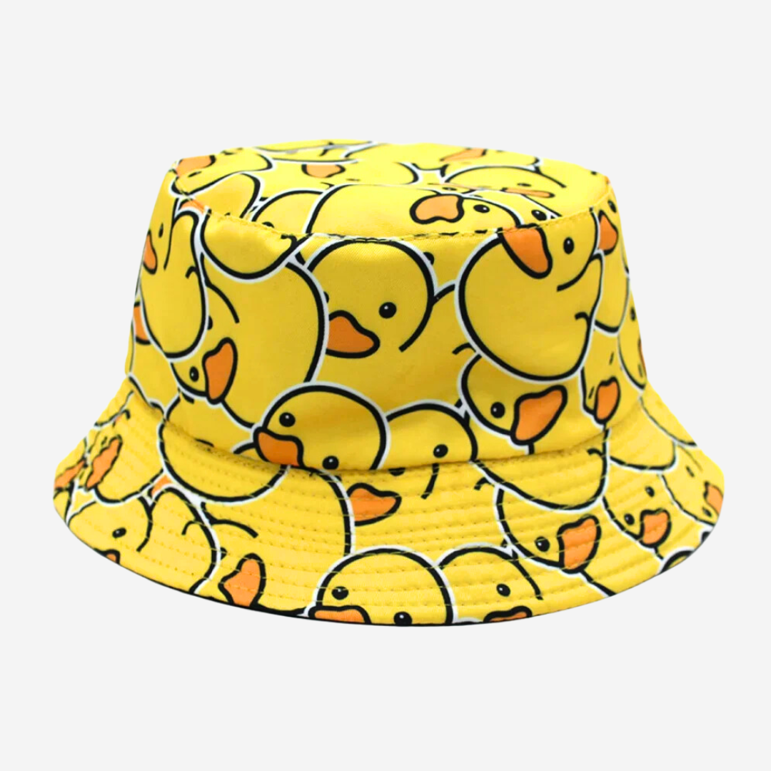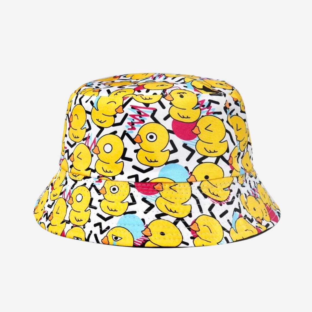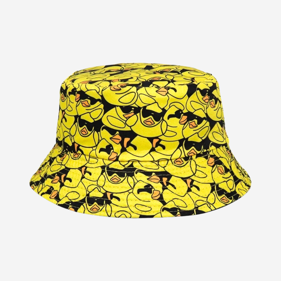 Make a splash this summer with the Quack Pack Duckling Bucket Hat! This vibrant yellow hat features an adorable all-over print of cheerful cartoon ducklings, adding a playful touch to any outfit.