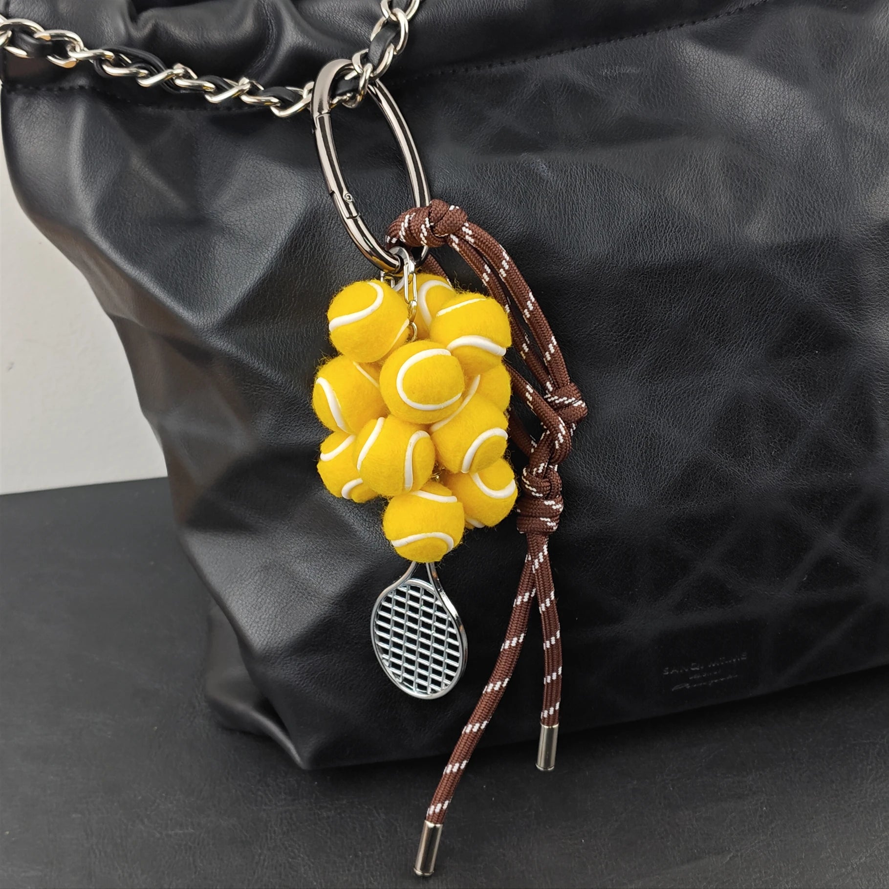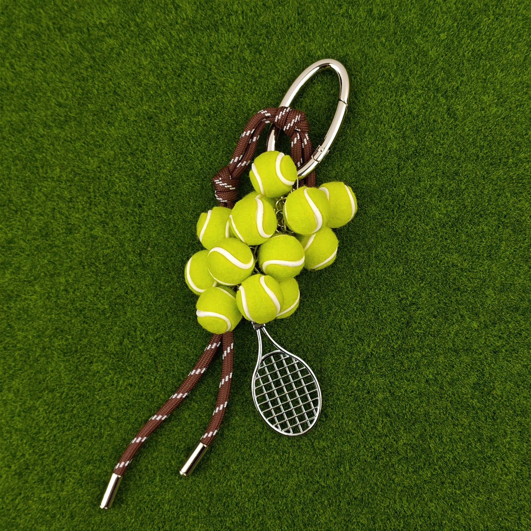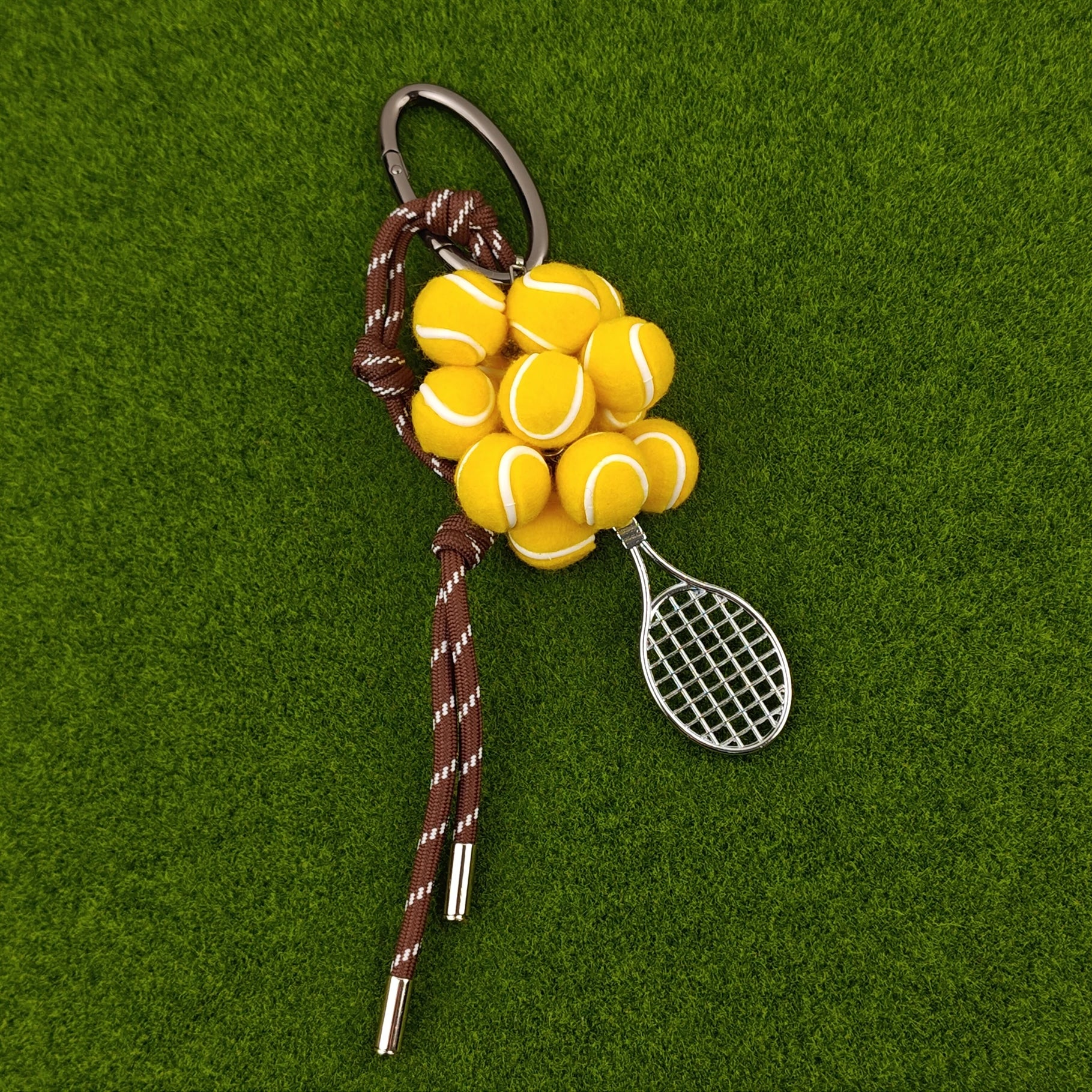 Brighten your look with playful tennis-ball “grapes” and a petite racquet that exudes sporty glam. Hand-braided cords add an artisanal touch, making it the perfect conversation starter on your keys or bag.
