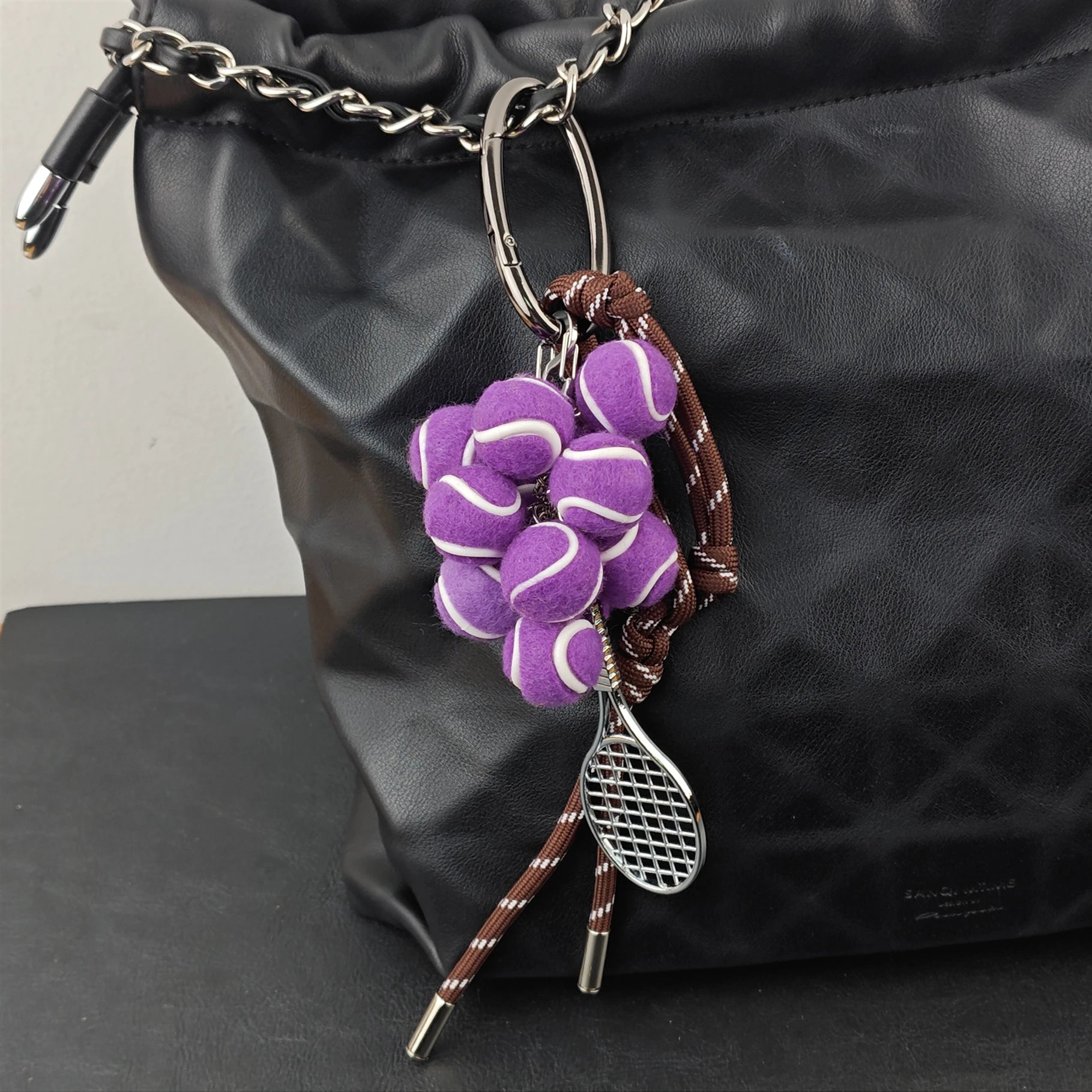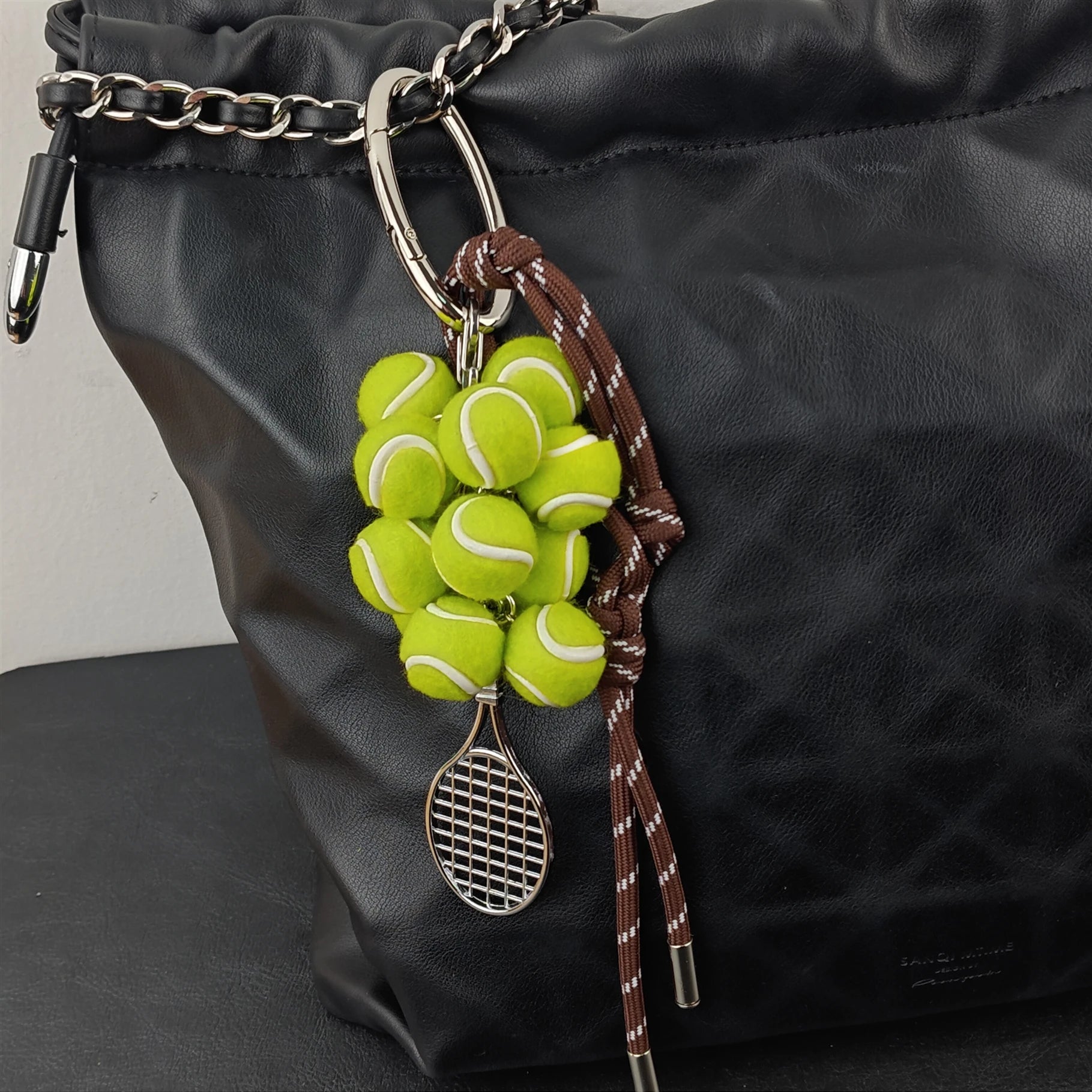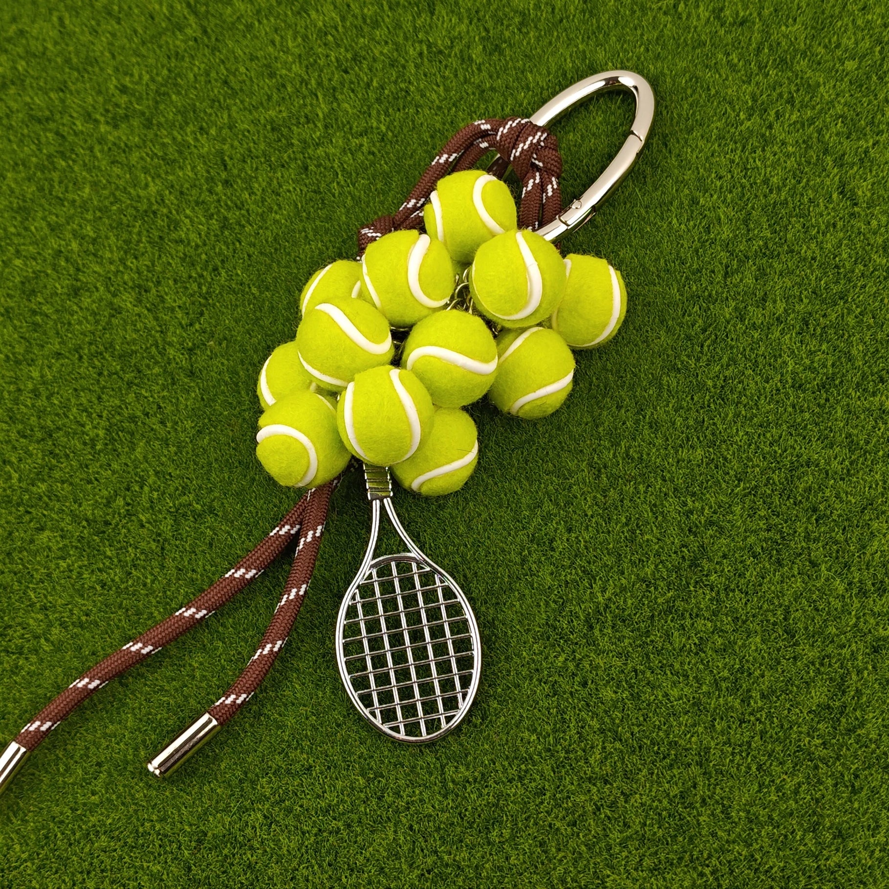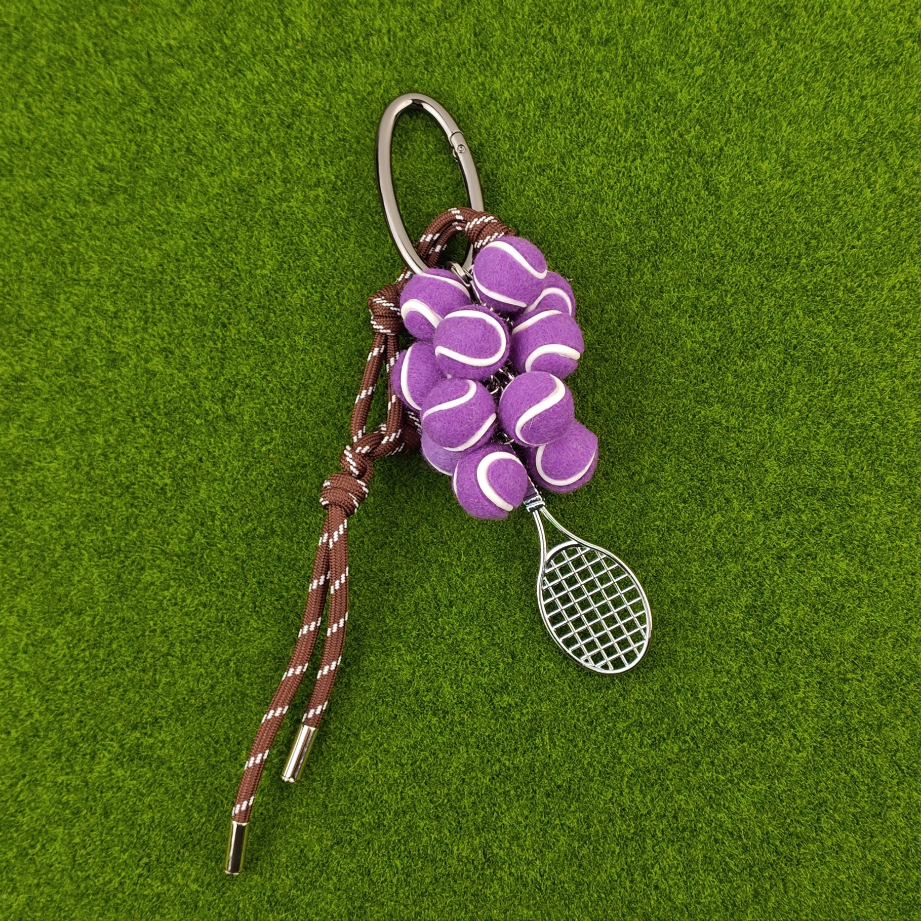 Brighten your look with playful tennis-ball “grapes” and a petite racquet that exudes sporty glam. Hand-braided cords add an artisanal touch, making it the perfect conversation starter on your keys or bag.