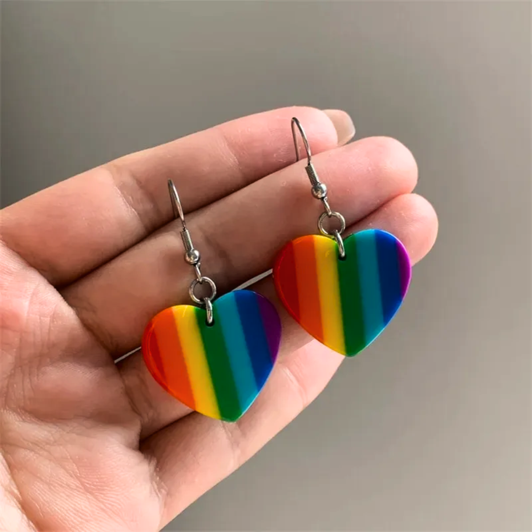 These vibrant earrings feature multi-colored heart-shaped charms that dance with the colors of the rainbow. Crafted with love, these earrings are more than just an accessory – they're a symbol of inclusivity, joy, and self-expression.
