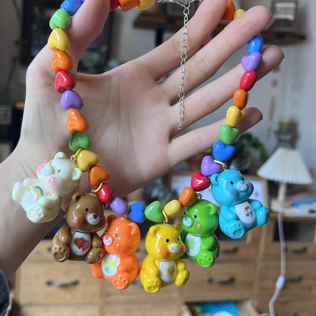 Rainbow‑lined heart beads carry a parade of glossy resin bears in every color, creating a cheerful statement that feels straight out of a 2000s sticker book. Finished with a lightweight link extender, it layers easily over tees or dresses for instant dopamine style.