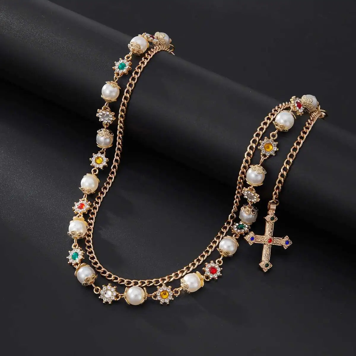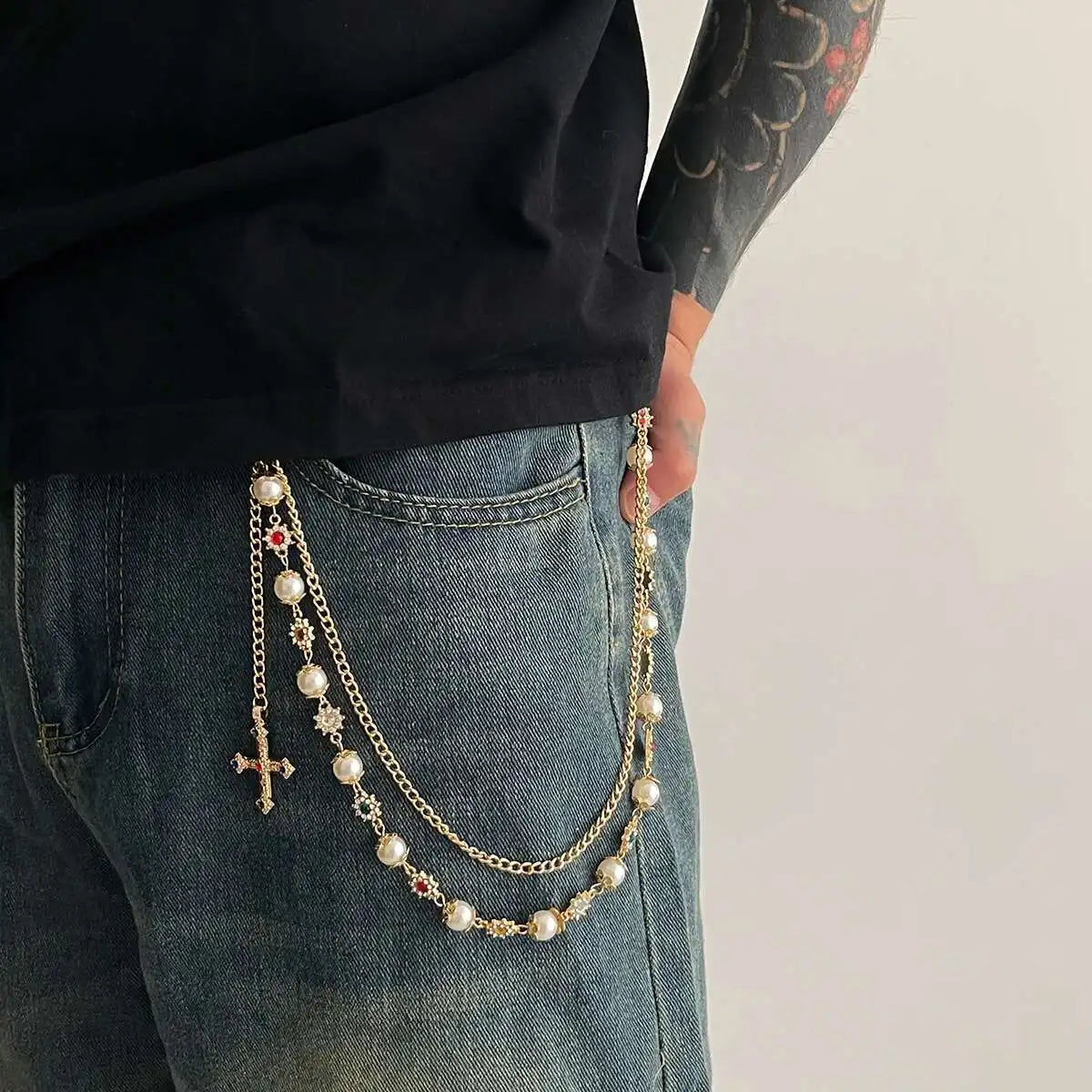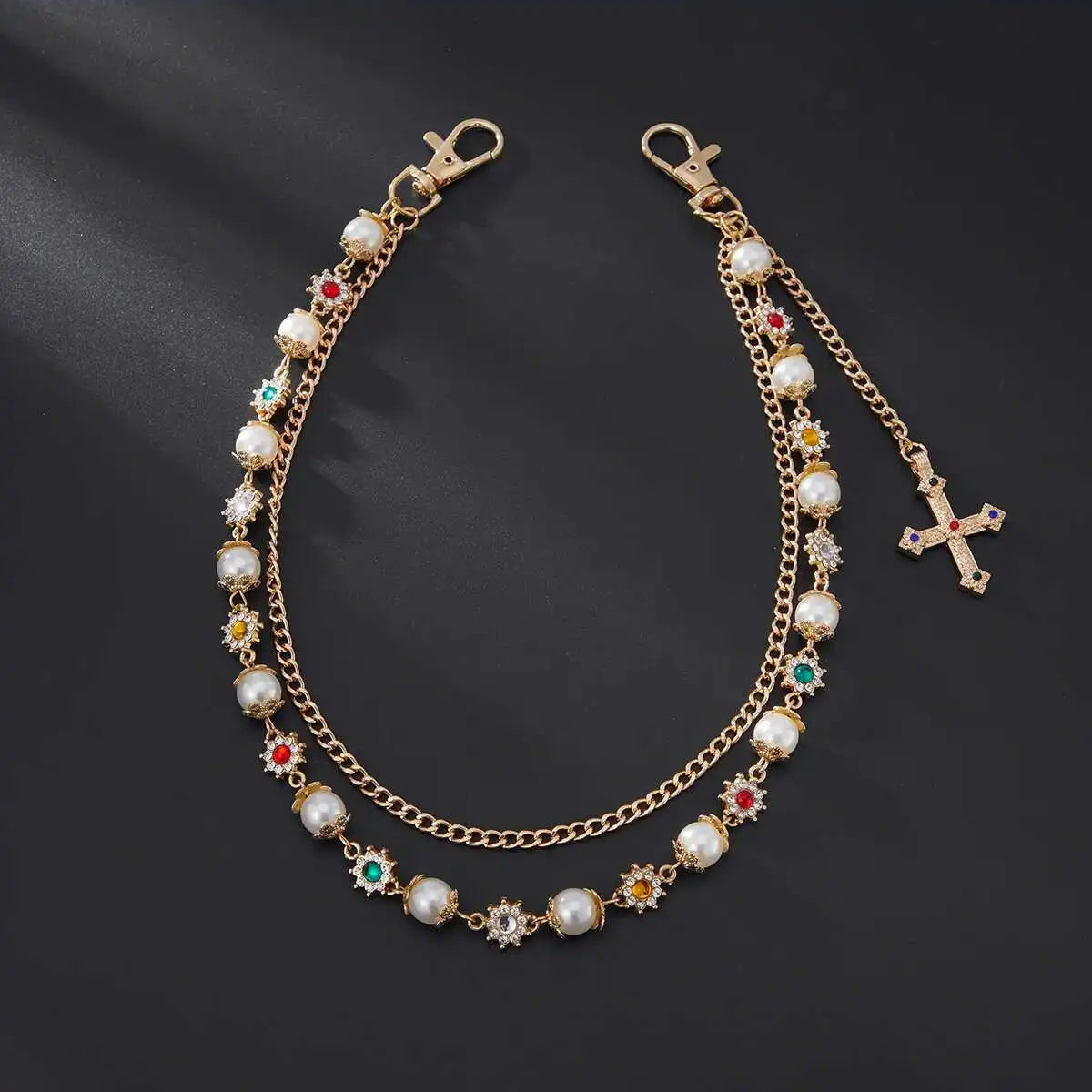 Three cascading strands—polished curb links, gloss pearls, and a fine cable—fall from matte‑gold hooks, punctuated by a dangling cross for instant street‑goth attitude. Clip it to belt loops or a bag ring to lock down your wallet while upgrading every fit.