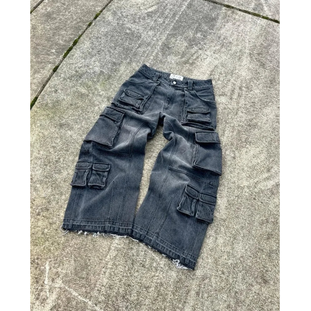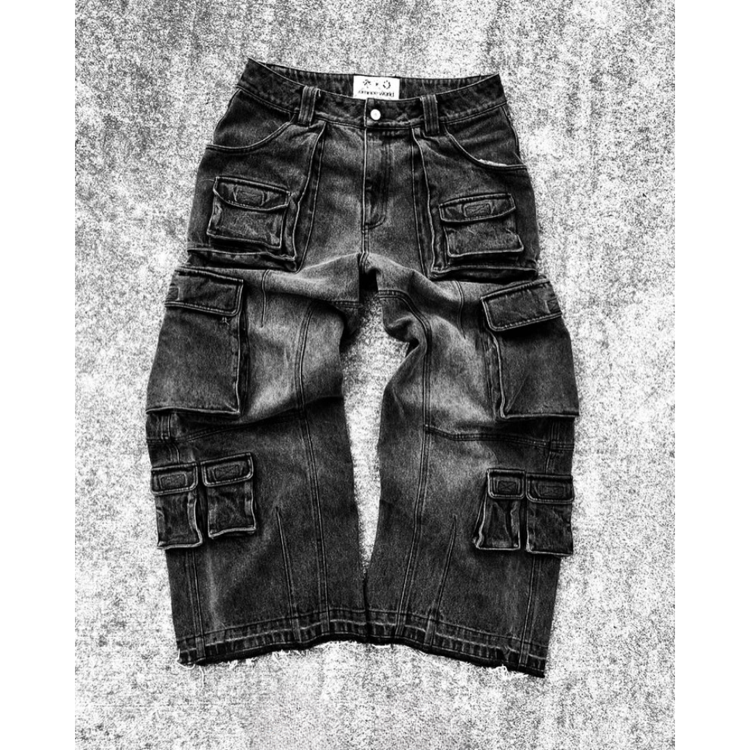 A rebellious blend of gothic grit and punk rock attitude. Crafted with washed-out gray denim, they feature an oversized fit, multiple pockets, and a vintage finish that's perfect for expressing your unique style.
