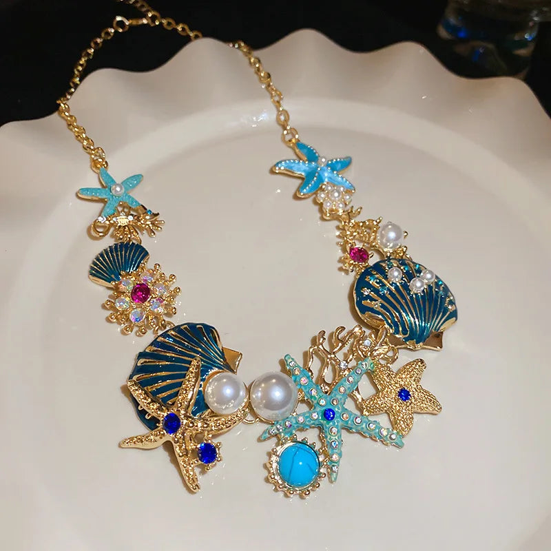 The star shell and coral pendants are intricately set with shimmering stones for an enchanting glow. Lightweight yet resilient, it graces any neckline with a flawless, refined look, perfect for exotic travels and glamorous nights out.