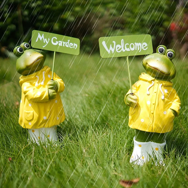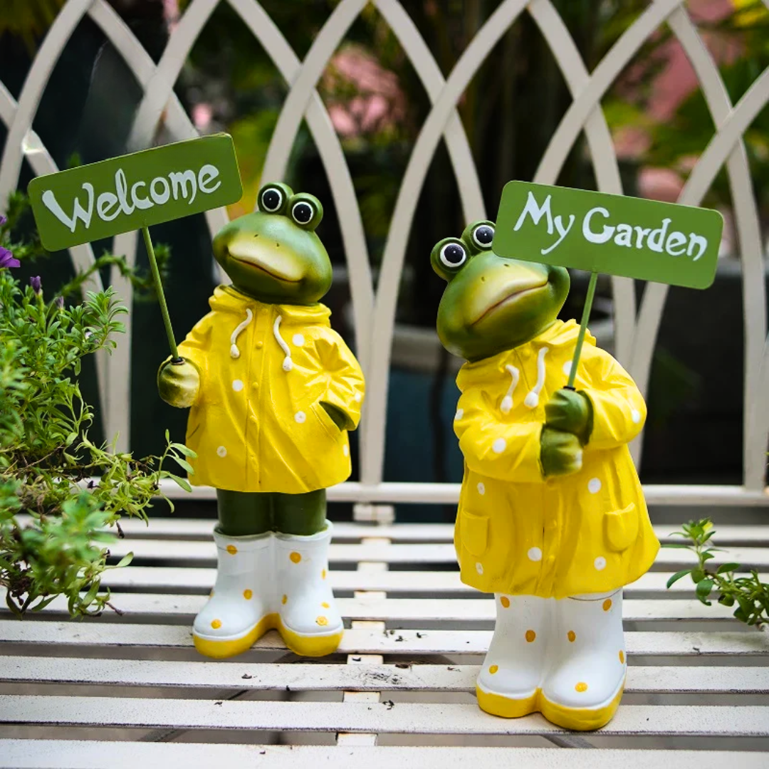Say hello to your new garden guardians! These adorable froggy friends, dressed to impress in their sunny yellow raincoats and matching hats, are ready to bring a splash of cheer and whimsy to your outdoor oasis.