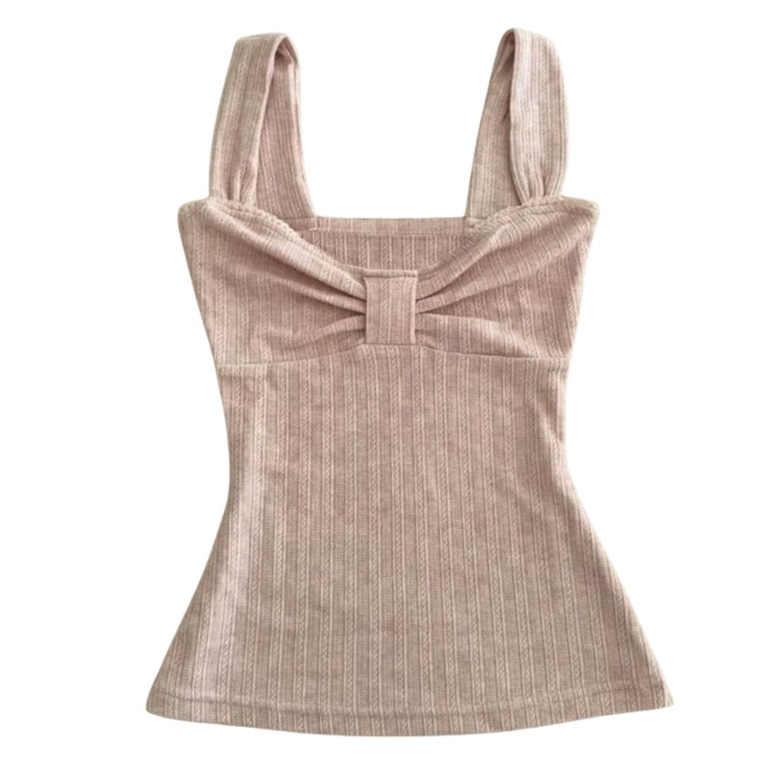 Refined minimalism meets Y2K sweetness in this rib‑knit cami, cut with a sculpting hourglass silhouette and an architectural bow‑front detail. Wear it solo with low‑rise denim or layer under a blazer—either way it reads polished and playful.