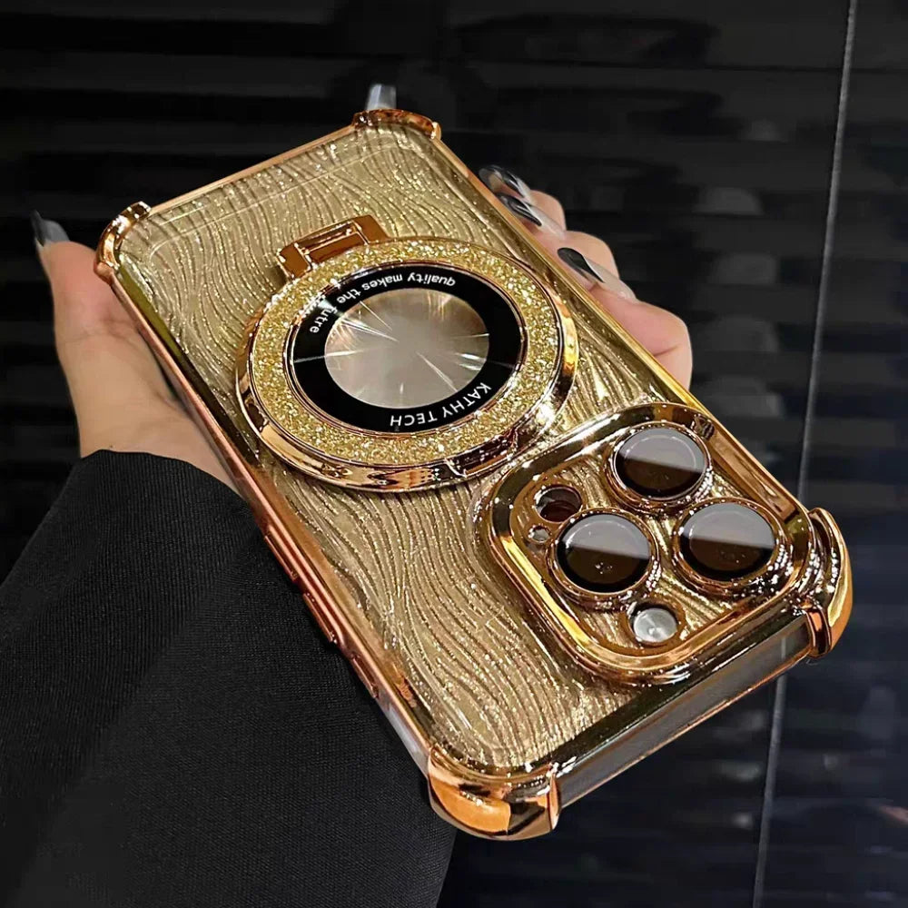 Make waves with The Ripple Effect Case! This eye-catching phone case is a mesmerizing blend of glitter and glam, featuring a unique water ripple design that shimmers and shines with every move. But it's not just about looks; this case is packed with features, including MagSafe compatibility and a handy folding holder that doubles as a ring and a stand.