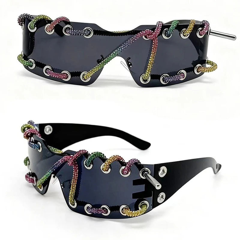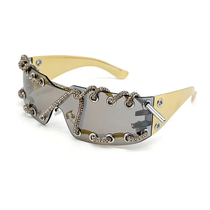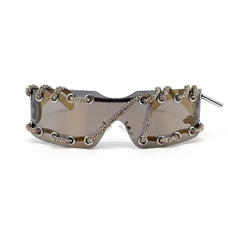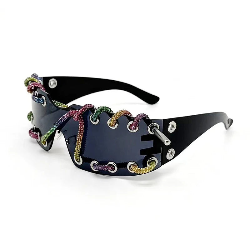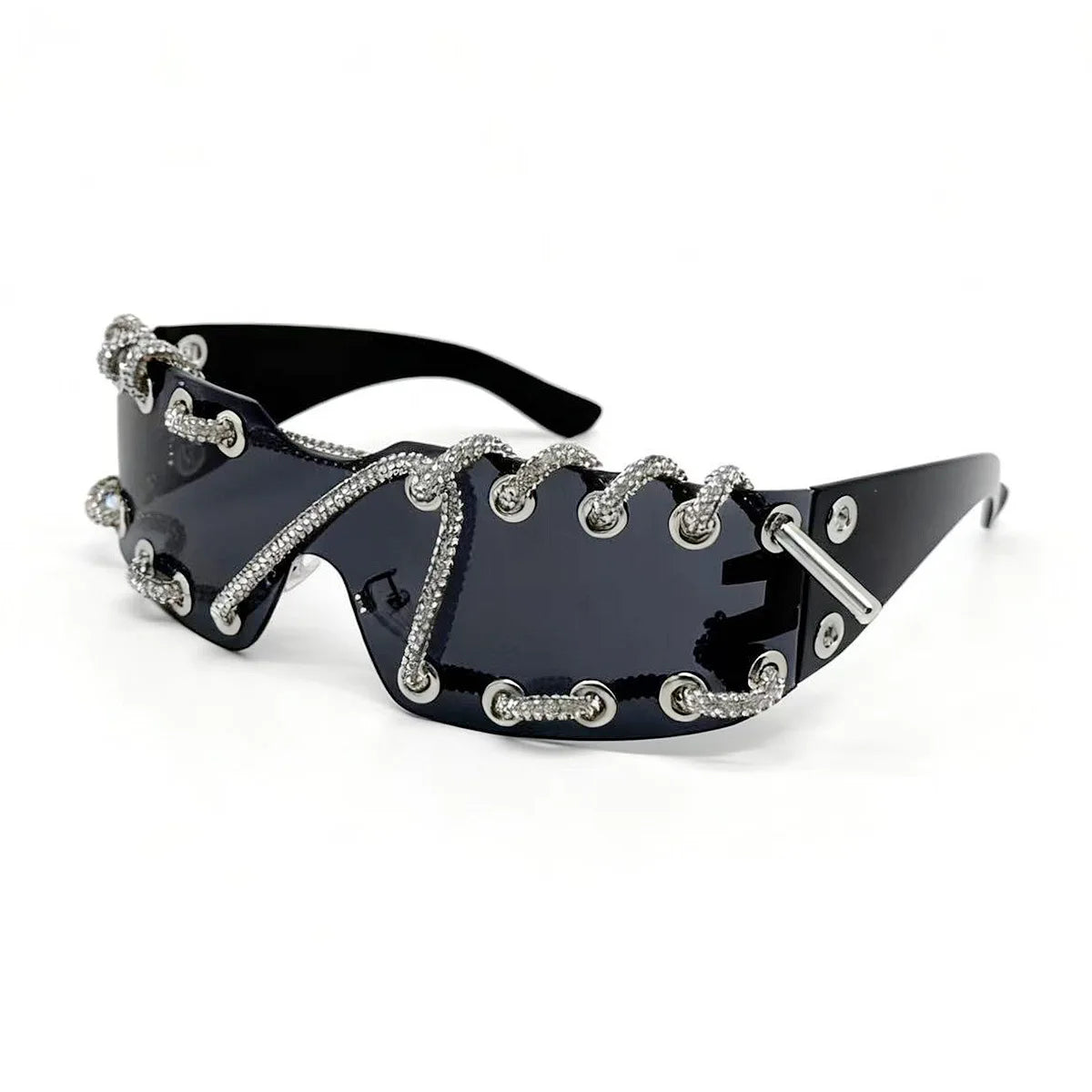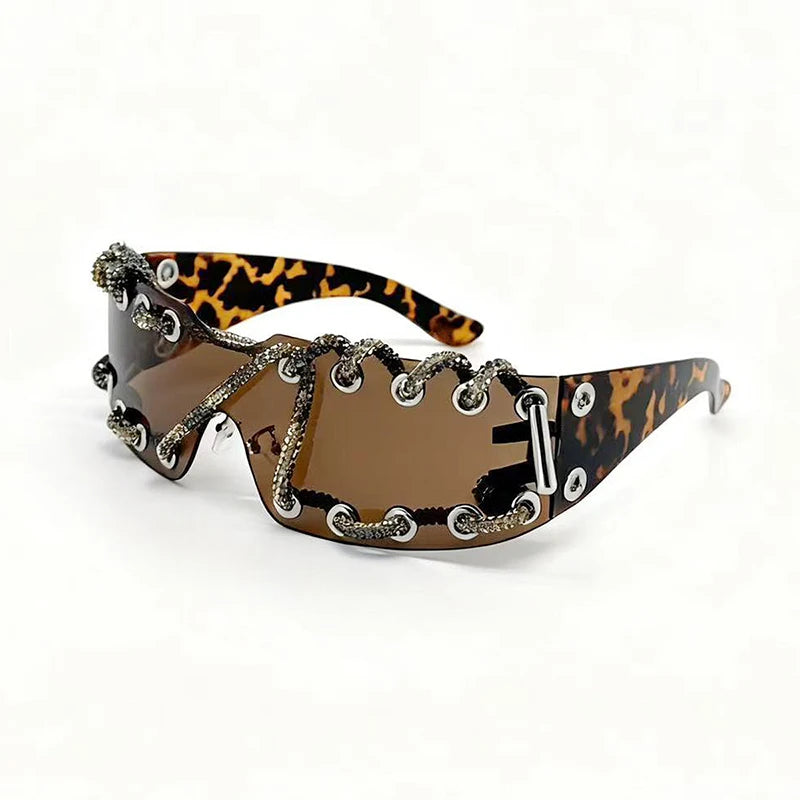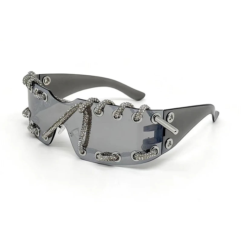 A one-piece shield lens edged with rivet chains for a hard, futuristic look. Built to be seen — sharp angles, heavy detailing, and full UV protection.