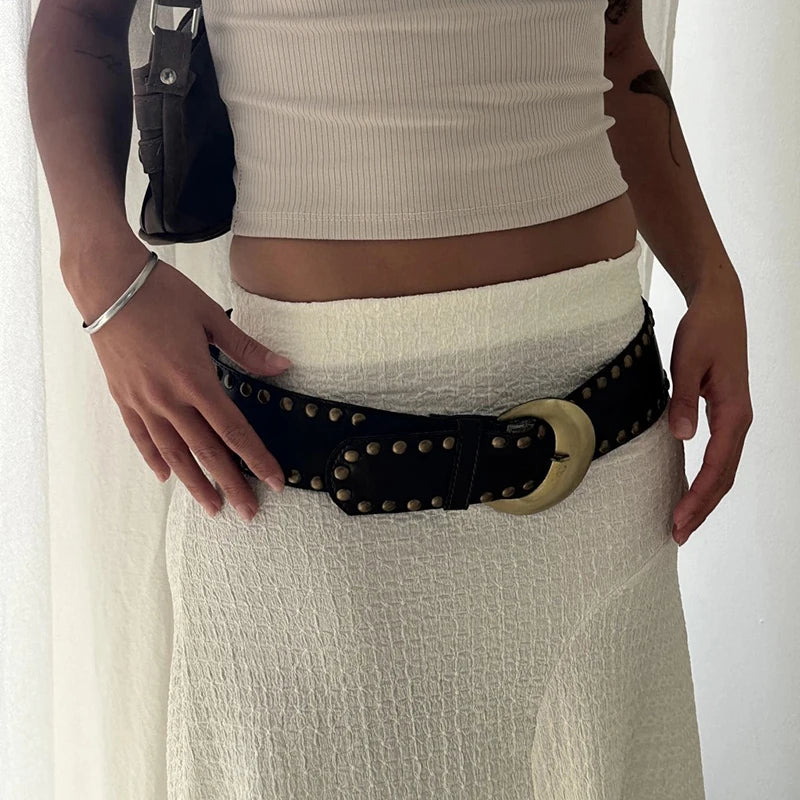 Supple midnight leather is edge‑bound with burnished brass rivets and closed by an oversized sand‑cast buckle, cinching the waist with effortless 2000s street‑glam energy that feels straight off a boutique runway.