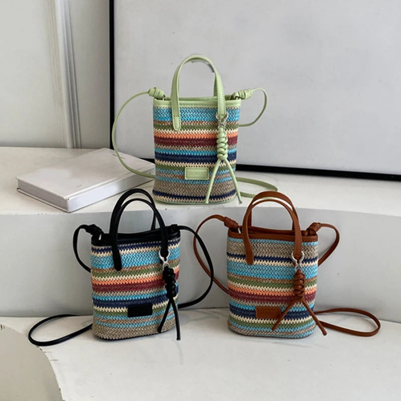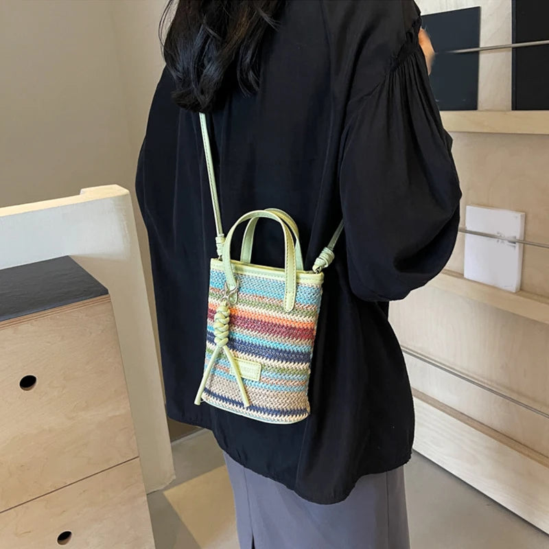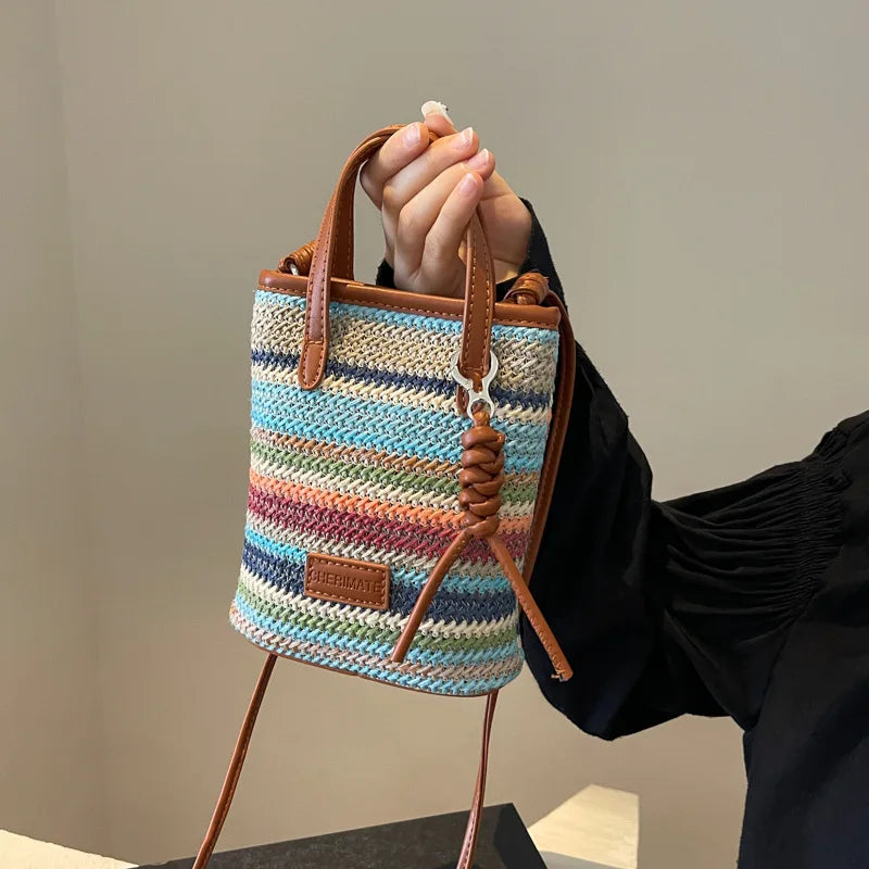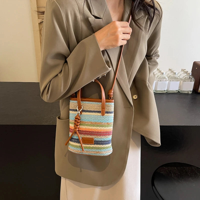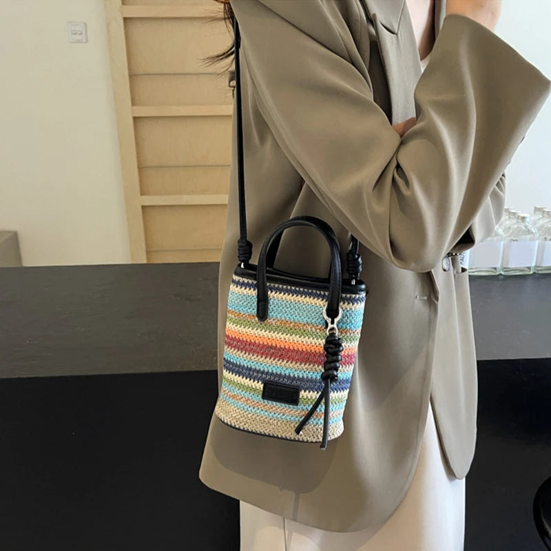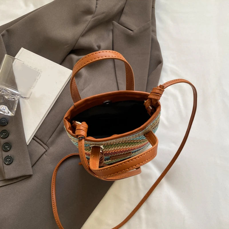Hand‑woven rainbow straw meets caramel leather trim in a pint‑size bucket that flashes “vacation” with every swing. Sized for just your phone, lipstick, and sunnies, it’s the little pop of color your summer feed has been waiting for.